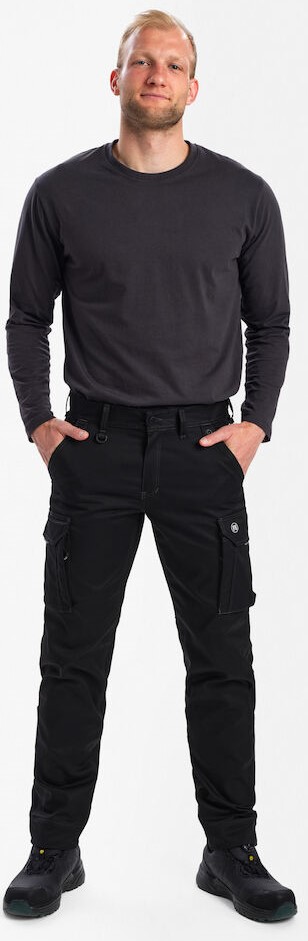Dehnbare, funktionelle Servicehose mit schmaler Passform und vielen praktischen Details. Optimale Passform, u. a. sorgen ergonomisch geformte Knie und Panel an der Innennaht für noch mehr Tragekomfort. Der Stretch-Stoff macht die Hose bequem, zudem sorgen Einsätze aus extrem elastischem, atmungsaktivem Material in Kniekehlen und Innennaht-Zwickel für extra hohen Tragekomfort. D-Ring vorne z. B. für eine ID-Karte. Zwei geräumige, schräg sitzende Einschubtaschen vorne. Zwei Gesäßtaschen. Zwei Schenkeltaschen mit Patte. Die Schenkeltaschen besitzen ein zusätzliches Fach mit Reißverschluss. In der rechten Schenkeltasche befindet sich eine verborgene Zollstocktasche. Gute Sichtbarkeit durch Reflexpaspeln mittig hinten auf den Hosenbeinen. Extra breiter Hosenaufschlag ermöglicht bei Bedarf eine Verlängerung der Schrittlänge. Für die Verlängerung der Schrittlänge ist bloß ein Saum aufzutrennen, dahinter kommt ein zusätzlicher Saum zum Vorschein.