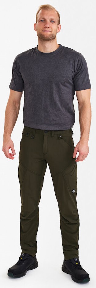 Funktionelle Servicehose mit vielen funktionellen Details. Der Stoff ist mit bequemem 4-Wege-Stretch für bessere Passform und mehr Bewegungsfreiheit und für maximalen Komfort mit Baumwolle auf der Innenseite ausgestattet. Die Hose hat einen ergonomisch geformten Kniebereich. Zwei geräumige Schrägtaschen vorne. Zwei Gesäßtaschen. Zwei Schenkeltaschen mit Reißverschluss. Die linke Schenkeltasche hat eine zusätzliche Handytasche. Die rechte Schenkeltasche hat Falten für zusätzliche Weite und eine Innentasche. D-Ring vorne für die Befestigung von z. B. Ausweisen. Breiter Saum unten, der ausgelassen werden kann, wenn zusätzliche Beinlänge erforderlich ist. Um die Hose zu verlängern, muss lediglich eine Naht aufgetrennt werden. Das Hosenbein ist trotzdem noch gesäumt.