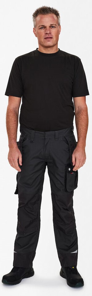 Funktionelle Arbeitshose mit vielen Details. Optimale Passform, u. a. sorgen ergonomisch geformte Knie und Panel an der Innennaht im Schritt für mehr Bequemlichkeit. Zwei geräumige, schräg sitzende Einschubtaschen sowie zwei Holstertaschen vorne. Schlaufe mit D-Ring (vorne) zur Befestigung einer ID-Karte. Zwei geräumige Gesäßtaschen mit Patte und Klettverschluss. Schenkeltasche mit Reißverschlusstasche fürs Handy, zusätzliche kleine Tasche. Sie ist geräumig und sorgt dank des freihängenden Bodens für mehr Bewegungsfreiheit. Unten verstärkte Zollstocktasche mit zusätzlichen Fächern. Auch die Zollstocktasche hat einen freihängenden Boden. Knieverstärkung/Knietasche mit Klettverschluss unten sowie zwei Einstellmöglichkeiten für Knieschutzkissen. Verstärkter Saum der Hosenbeine hinten und vorne für extra hohe Verschleißfestigkeit. Reflexstreifen an den Knien und unten an den Hosenbeinen für mehr Sichtbarkeit. Für Industriewäsche geeignet.