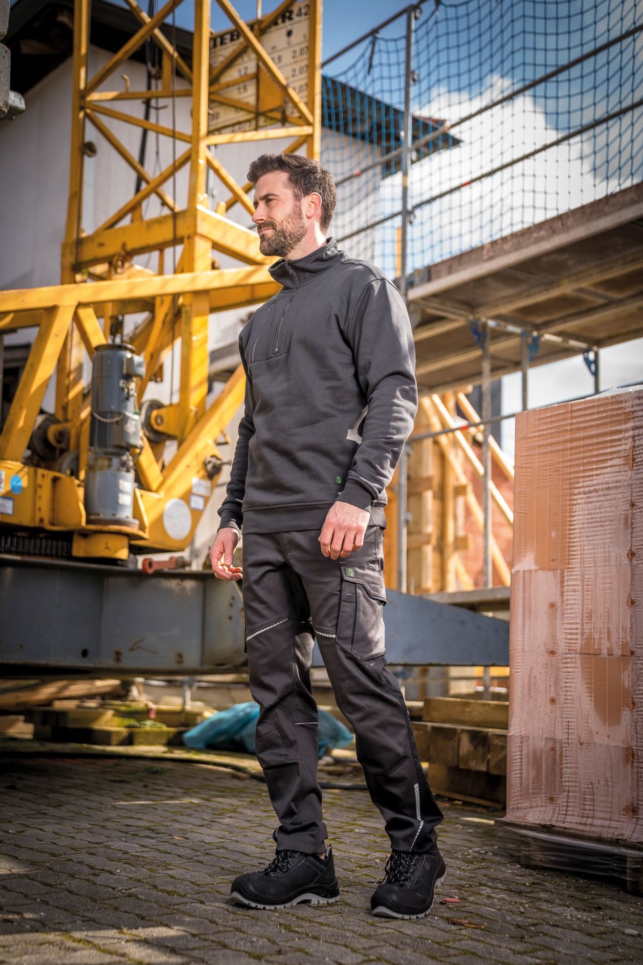 - Material: 55 % Baumwolle, 42 % Polyester, 3 % Elasthan (Spandex), 290 g/m²