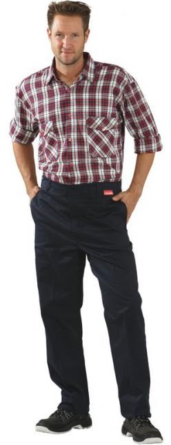 Rundbund mit 7 Schlaufen, Hosenschlitz geknöpft, 2 eingesetzte Vordertaschen, 1 verstärkte Gesäßtasche, 1 Maßstabtasche.