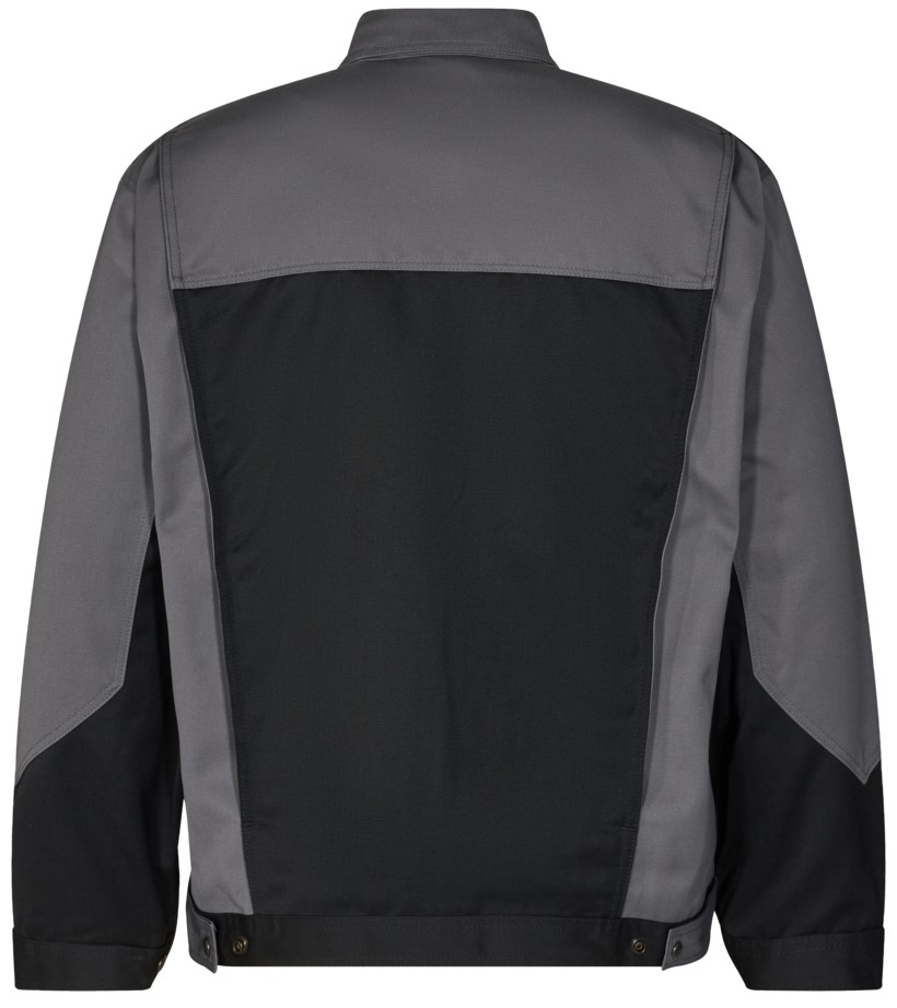 Arbeitsbundjacke mit verdecktem Kunststoffreißverschluss in passendem Farbdesign. Dunkel gefärbte Druckknöpfe. Brusttasche mit Patte und Klettverschluss links. Offene Brusttasche mit verschließbarer Handytasche rechts. Zwei Eingrifftaschen. Dreifach Kappnähte. Innentasche mit Patte. Verstärkte Oberarme. Bund und Manschetten verstellbar. Zwei Dehnfalten im Rücken für mehr Bewegungsfreiheit. Für Industriewäsche geeignet.