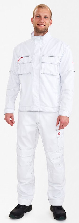 Funktionelle Arbeitsjacke mit Kontraststeppnähten. Verdeckter Reißverschluss und Klettverschluss vorn. Zwei geräumige Einschubtaschen vorn. Zwei Brusttaschen mit Patte und Klettverschluss. Rechte Brusttasche mit Fächern (z. B. für Stifte). Linke Tasche mit Paspeltasche mit Reißverschluss, Schlaufe mit D-Ring und extra Tasche mit Fach für Werkzeug. Zwei geräumige Innentaschen mit Klettverschluss. Gute Sichtbarkeit durch Reflexpaspeln.