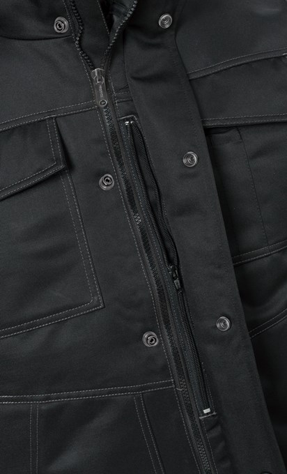 - 2 Brusttaschen mit Patte und Druckknopfverschluss, eine mit Stifttaschen und innenliegendem D-Ring