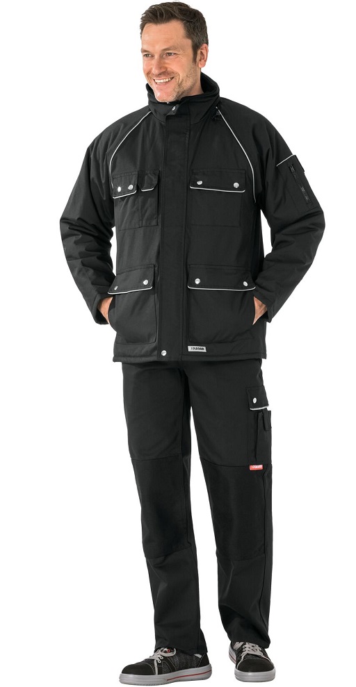 Wasserdicht, Nähte hinterklebt, Fleecekragen, Reflexbiesen an den Schultern und Taschenpatten, Armbeugen mit Cordura® abgesetzt, Kapuze im Kragen, aufgesetzte Handytasche rechts, 2 seitliche Einschubtaschen, 2 Brusttaschen mit Patte und Druckknöpfen zu verschließen, Ärmeltasche links, Innentasche mit Klettverschluss, Innenfutter gesteppt, verdeckter Frontreißverschluss, Strickbündchen an den Ärmeln und am Bund