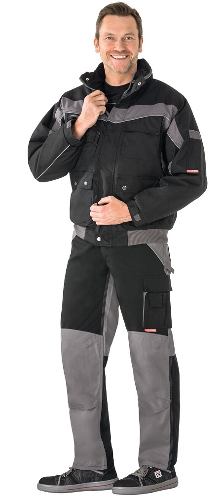 Atmungsaktiv, wasserdicht, Nähte hinterklebt, Fleecekragen, Reflexbiesen als Sicherheitsausstattung, Kapuze im Kragen, 1 Brusttasche links mit Patte und Klettverschluss, doppelte Brusttasche rechts, Handytasche auf der rechten Brust, 2 Stiftfächer, 2 seitliche Einschubtaschen, 2 aufgesetzte Seitentaschen, Ärmeltasche links, Dokumententasche unter der Frontpatte, Innenfutter gesteppt, verdeckter Frontreißverschluss, Strickbündchen am Bund, elastische Ärmelbündchen durch Klettband verstellbar.