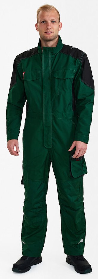 Funktionelle Overall mit vielen Details. Optimale Passform, u. a. sorgen ergonomisch geformte Knie, eine elastische Taille und Panel an der Innennaht im Schritt für mehr Bequemlichkeit. Verdeckter Reißverschluss vorn. Zwei Brusttasche mit Patte – die rechte mit Schlaufe und D-Ring zur Befestigung einer ID-Karte, die linke mit zusätzlicher Reißverschlusstasche fürs Handy. Verstellbare Ärmelbündchen. Zwei geräumige, schräg sitzende Einschubtaschen vorne. Zwei geräumige Gesäßtaschen mit Patte und Klettverschluss. Schenkeltasche mit Reißverschlusstasche und zusätzlicher kleiner Tasche. Sie ist geräumig und sorgt dank des freihängenden Bodens für mehr Bewegungsfreiheit. Unten verstärkte Zollstocktasche mit zusätzlichen Fächern. Auch die Zollstocktasche hat einen freihängenden Boden. Knieverstärkung/Knietasche mit Klettverschluss unten sowie zwei Einstellmöglichkeiten für Knieschutzkissen. Verstärkter Saum der Hosenbeine hinten sowie vorne und Verstärkung an den Ellenbogen für extra hohe Verschleißfestigkeit. Reflexstreifen an Schultern, Taille und Knien und unten an den Hosenbeinen für bessere Sichtbarkeit. Für Industriewäsche geeignet.