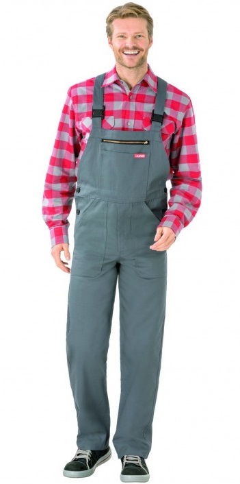 Brustlatz mit Messing-Reißverschluss, zusätzlich aufgesetzte Latztasche, 2 aufgesetzte, verstärkte Vordertaschen, 1 Gesäßtasche, 1 Maßstabtasche, verstellbare Seitenschlitze, Hosenschlitz mit Reißverschluss, hochgezogenes Rückenteil mit solide konstruiertem elastischen Zwischenteil, Sicherheitsschnallen an den Trägern.