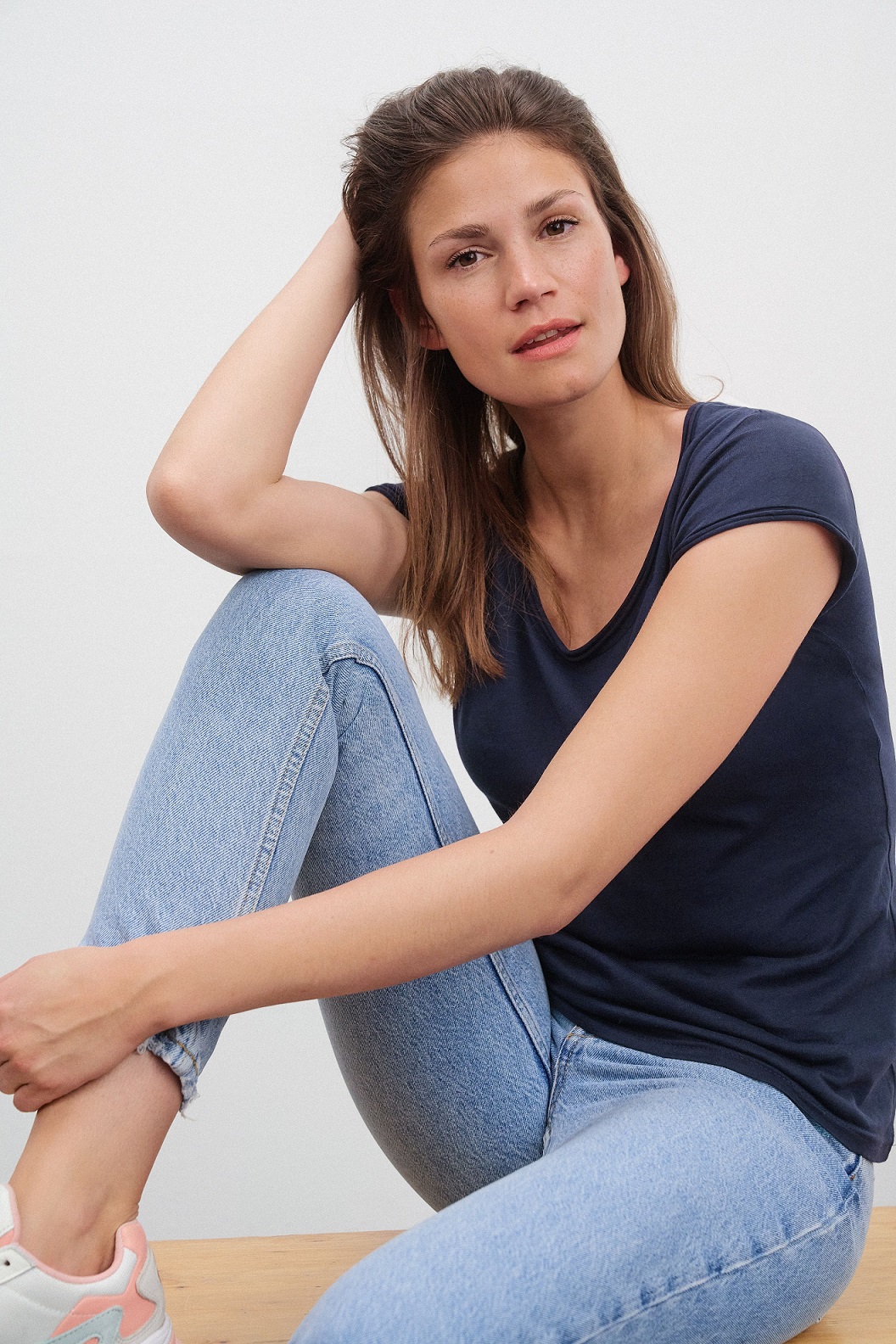 - Halsferner Rundhalsausschnitt und Ärmel mit Rollsaum