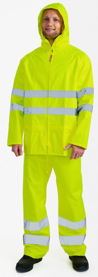 Leichtes und praktisches Regenset aus Jacke und Hose. Die Jacke hat einen Reißverschluss vorn. Zwei Vordertaschen. Verstellbare Kapuze, die sich zusammenrollen lässt, wenn sie nicht gebraucht wird. Verstellbar am Bund und an den Manschetten. Die Hose hat einen Gummizug an der Taille. Durchgriff zu den Taschen. Verstellbar unten an den Hosenbeinen. Reflexstreifen um Ärmel, Bund und Beine. Verschweißte Nähte. Bekleidungsklasse 3 (Jacke). Bekleidungsklasse 2 (Hose).