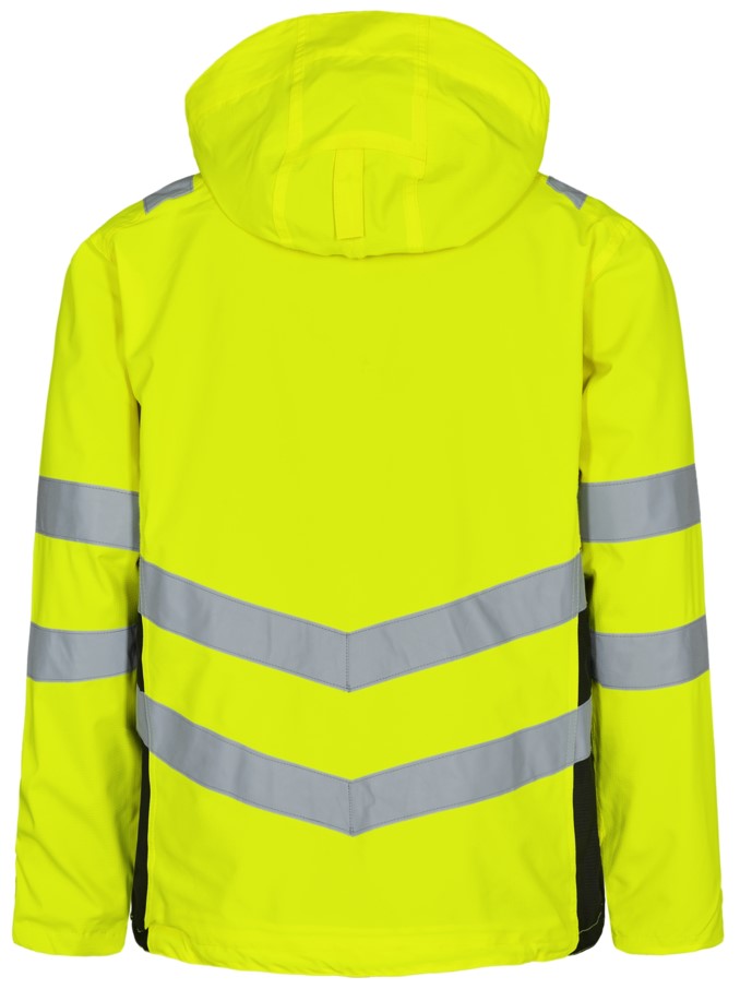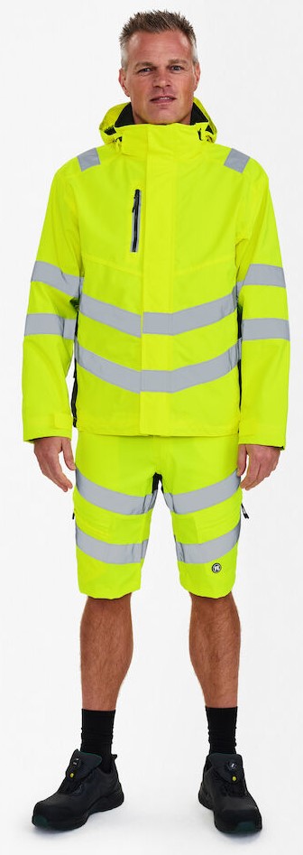 Fluoreszierende, atmungsaktive sowie wasser- und winddichte Shelljacke mit verschweißten Nähten und hohem Kragen im modernen Design. Doppelte Knopfleiste mit Reißverschluss sowie Klettverschluss vorne. Die Jacke kann mit den Modellen 1192-236, 1159-158 und 5159-158 kombiniert werden, die alle einen Reißverschluss zum Einzippen haben. Zwei geräumige Seitentaschen und Brusttasche mit Reißverschluss sowie große Innentaschen mit Klettverschluss. Abnehmbare, verstellbare Kapuze mit ausreichend Platz für den Arbeitshelm. Verstellbare Manschetten. Reißverschluss im Futter, für Aufdruck/Stickerei eignet. Reflexstreifen über die Schulterpartie hinweg sowie rund um Ärmel und Körper. Bekleidungsklasse 3. Nach 50 mal Waschen getestet.