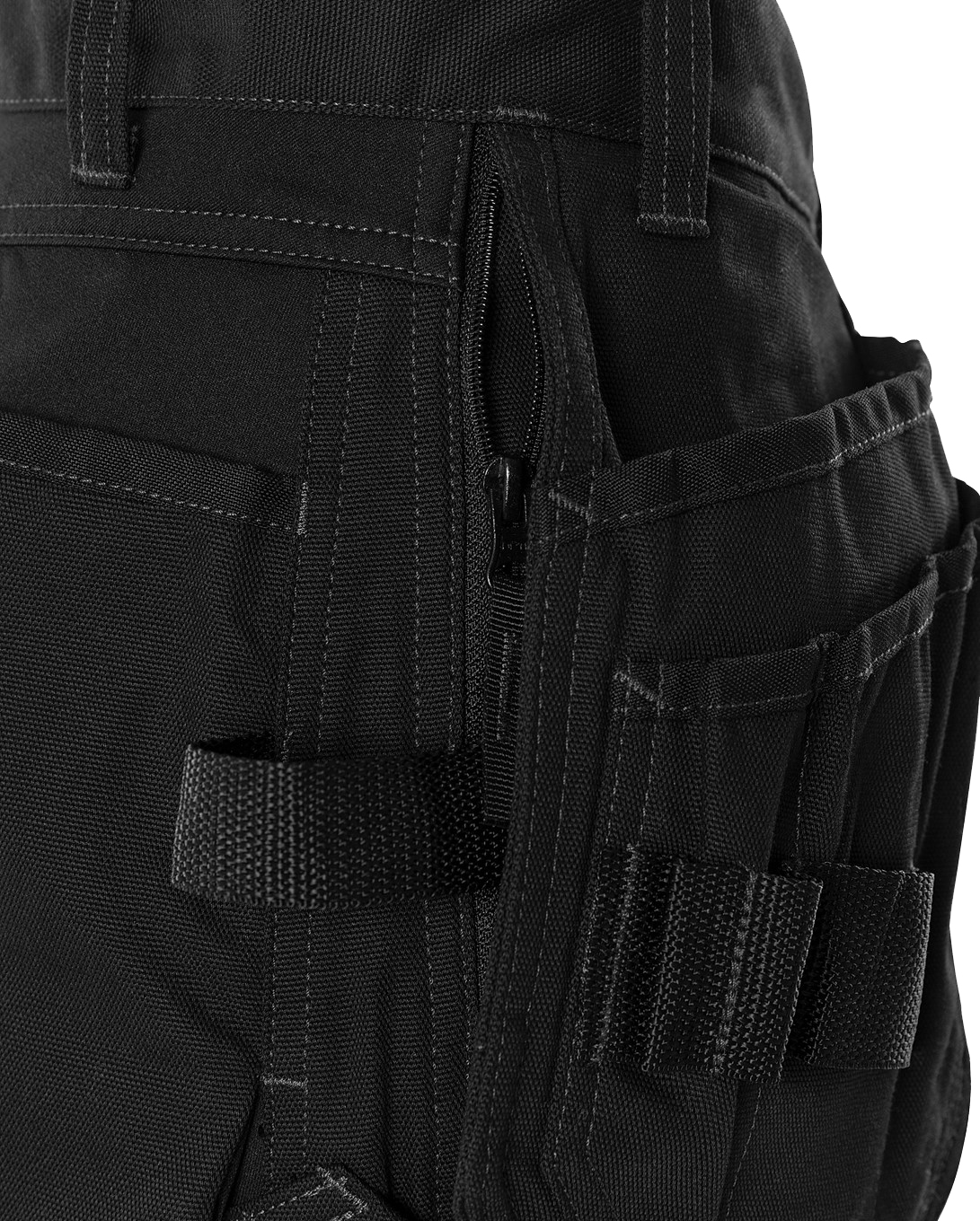 - 2 CORDURA®-verstärkte, lose hängende Taschen, eine mit 2 Taschen, davon eine mit Reißverschluss, eine mit 3 kleineren Taschen und Werkzeugschlaufen