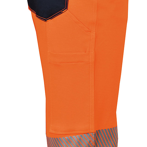 1 segmentierter Reflexstreifen auf dem Schenkel, 2 mit Klettverschluss verschlossene Gesäßtaschen, wobei eine mit Patte, 2 umlafende reflektierende Streifen an den Beinen, breite Vordertaschen, ergonomische Gestaltung an den Knien, Hammerschlaufe, Seitentasche, Zollstocktasche