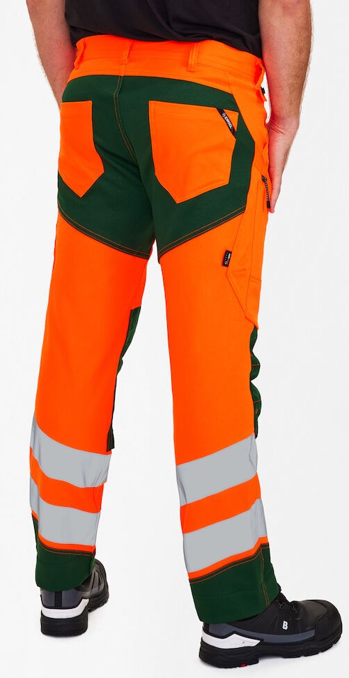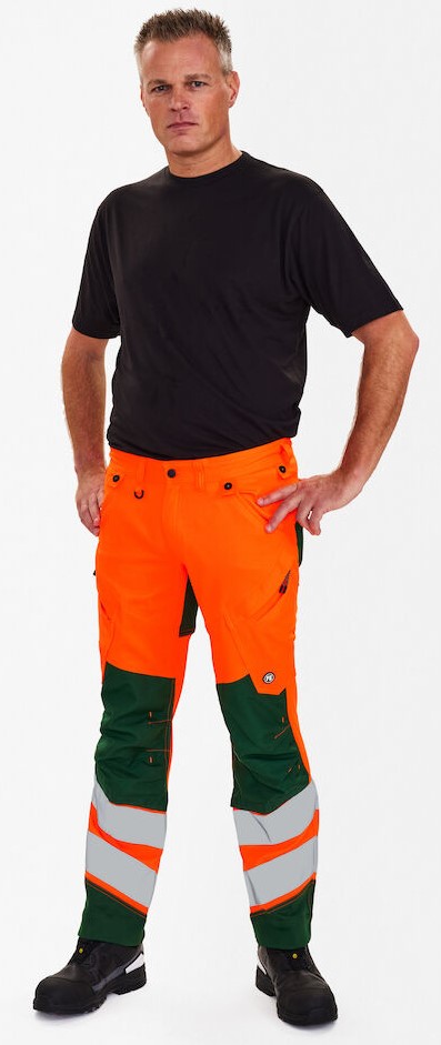 Dehnbare, funktionelle und fluoreszierende Hose im modernen Design. Optimale Passform mit u. a. ergonomisch geformtem Kniebereich. Der dehnbare Stoff sorgt für optimale Bewegungsfreiheit und Komfort. D-Ring vorne für die Befestigung von z. B. Ausweisen. Zwei geräumige Schrägtaschen vorne. Zwei Gesäßtaschen. Zwei Schenkeltaschen mit Reißverschluss. Die linke Schenkeltasche hat eine zusätzliche Handytasche. Die rechte Schenkeltasche hat eine aufgesetzte verstärkte Zollstocktasche mit zusätzlichen Unterteilungen. Knieverstärkung/Knietasche mit Klettverschluss unten und besteht aus CORDURA®-Material. Reflexstreifen am Unterschenkel. Breiter Saum unten, der ausgelassen werden kann, wenn zusätzliche Beinlänge erforderlich ist. Um die Hose zu verlängern, muss lediglich eine Naht aufgetrennt werden. Das Hosenbein ist trotzdem noch gesäumt. Bekleidungsklasse 2. Nach 50 mal Waschen getestet.