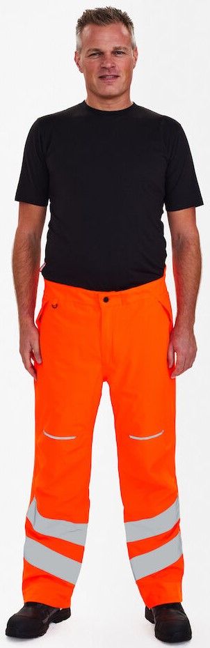 Fluoreszierende atmungsaktive, wasser- und winddichte Winterhose mit verschweißten Nähten. Zwei Fronttaschen mit Klettverschluss. D-Ring vorne für die Befestigung von z. B. Ausweisen. Extra hoher Lendenbereich und verstellbarer Gummizug in der Taille für maximalen Komfort. Verdeckter Zwei-Wege-Reißverschluss an den Beinen, der den Zugang zur Innenbekleidung ermöglicht sowie Schneefang/Windfang an den Beinen. Knieverstärkung. Reflexstreifen am Unterschenkel. Bekleidungsklasse 3. Nach 50 mal Waschen getestet.