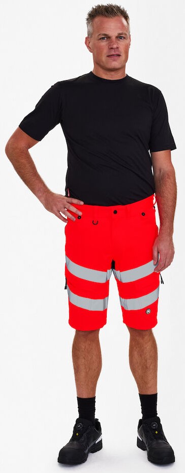 Dehnbare, funktionelle und fluoreszierende Shorts im modernen Design. Optimale Passform. Der dehnbare Stoff sorgt für optimale Bewegungsfreiheit und Komfort. D-Ring vorne für die Befestigung von z. B. Ausweisen. Zwei geräumige Schrägtaschen vorne. Zwei Gesäßtaschen. Zwei Schenkeltaschen mit Reißverschluss. Die linke Schenkeltasche hat eine zusätzliche Handytasche. Die rechte Schenkeltasche hat eine aufgesetzte verstärkte Zollstocktasche mit zusätzlichen Unterteilungen. Bekleidungsklasse 1. Nach 50 mal Waschen getestet.