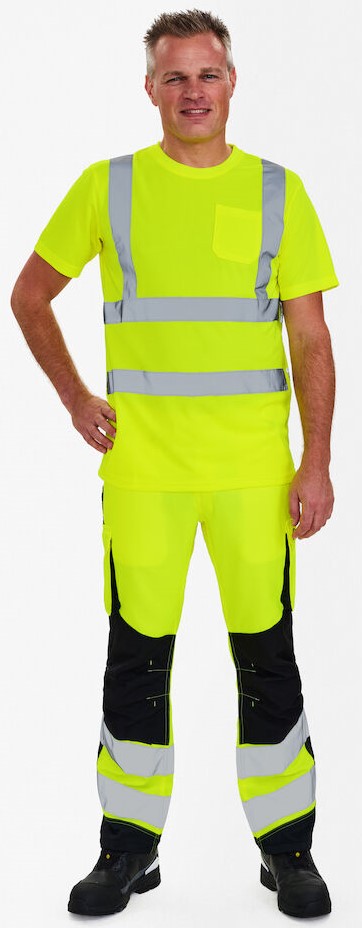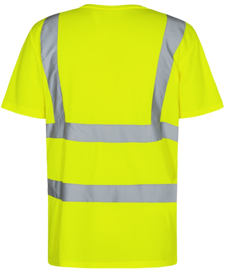 Bequemes und schickes, fluoreszierendes T-Shirt aus leichtem Material. Rippstrick am Hals sowie Tasche auf der linken Brustseite. Aufgenähte Reflexstreifen über die Schulterpartie hinweg sowie rund um die Taille. Mit Brusttasche. Bekleidungsklasse 2. Getestet nach 25 Wäschen.
