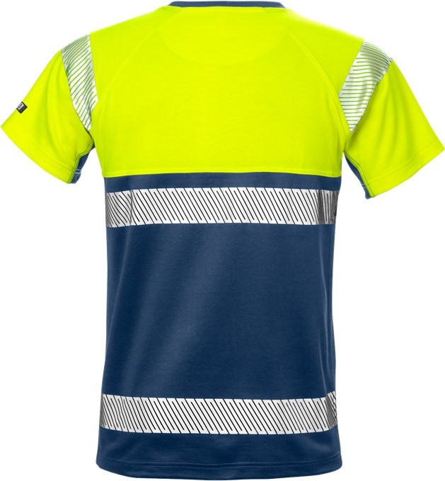 Warnschutz-T-Shirt mit elastischem Reflexband für zusätzliche Bewegungsfreiheit. Hergestellt aus einem weichen und bequemen Material mit Baumwolle auf der Innenseite. Transportiert Feuchtigkeit, trocknet schnell und ist UV-geschützt.