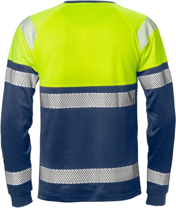 Warnschutz-T-Shirt mit langen Ärmeln und reflektierendem Stretchbesatz für mehr Bewegungsfreiheit. Hergestellt aus einem weichen und bequemen Material mit Baumwolle auf der Innenseite. Transportiert Feuchtigkeit, trocknet schnell und ist UV-geschützt.