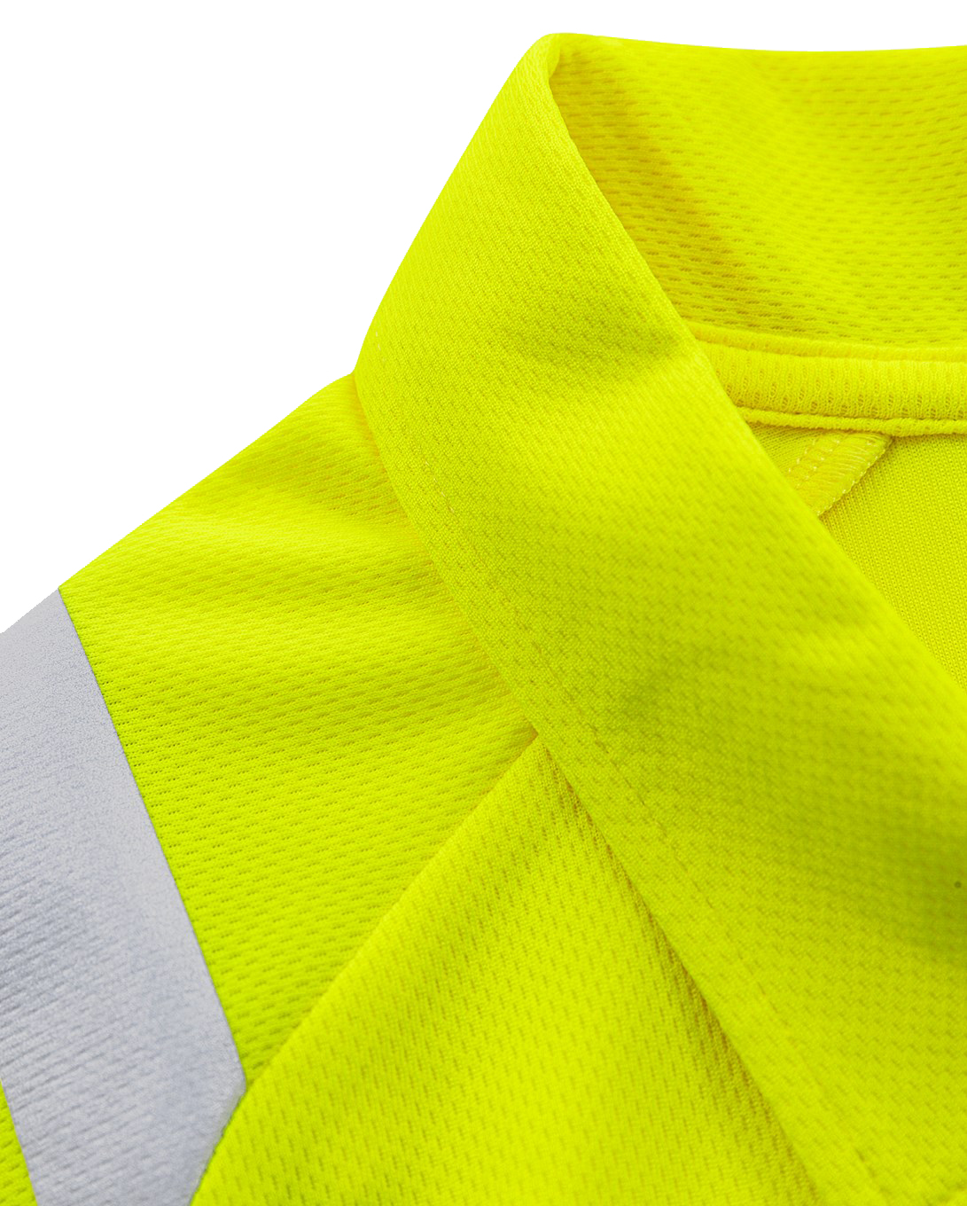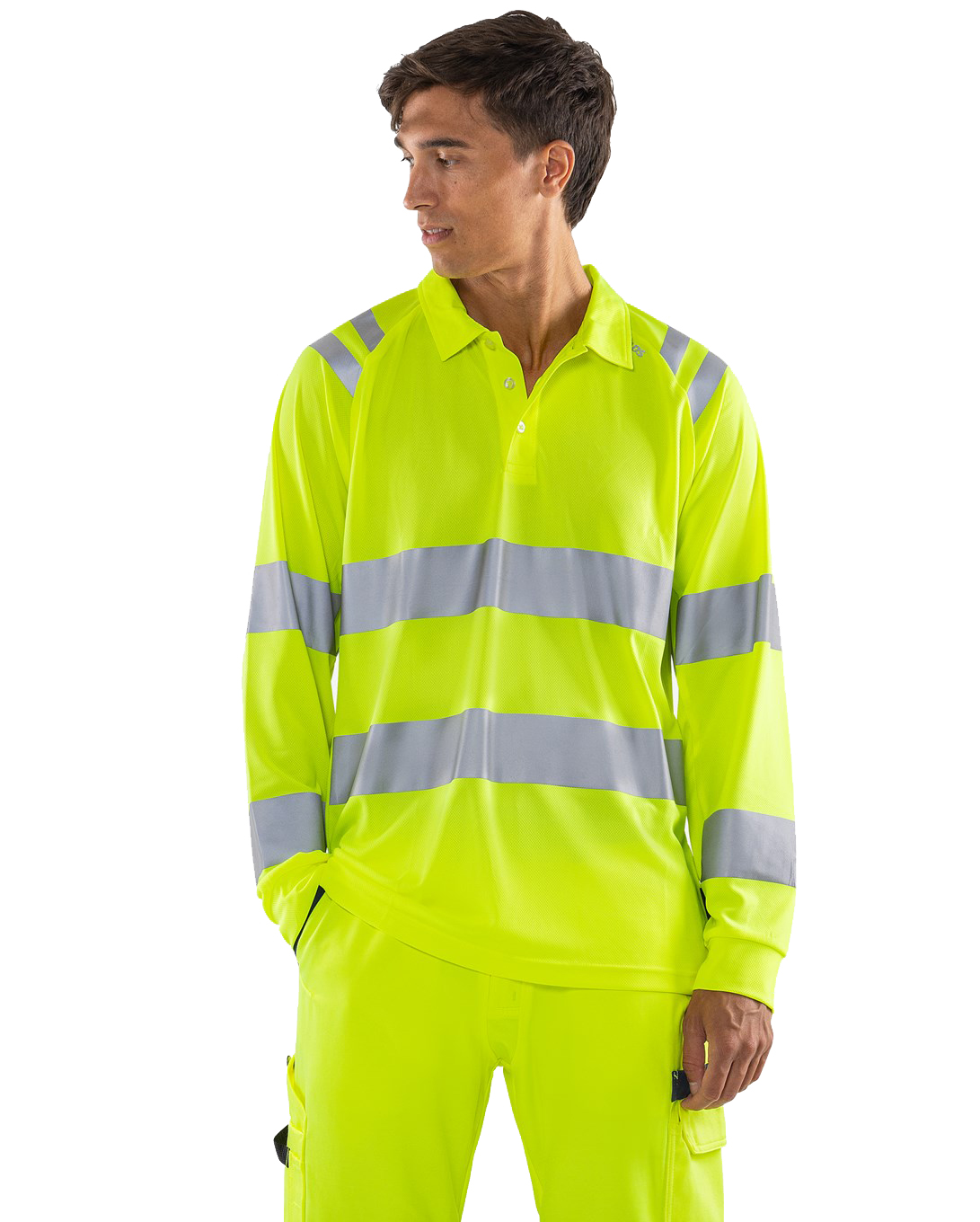 Langärmeliges Warnschutz-Poloshirt aus recyceltem Material in einem Funktionsstrick für bessere Atmungsaktivität. Das leichte und luftige Material bietet hohen Tragekomfort an warmen Arbeitstagen. Konzept: Trofta