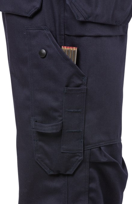 Flammschutzhose, zertifiziert gemäß Warnschutznorm Klasse 1. Handwerkermodell aus haltbarem, bequemen, flammhemmend behandeltem Material mit Knietaschen aus flammhemmendem CORDURA®. Für 50 industrielle Wäschen getestet.