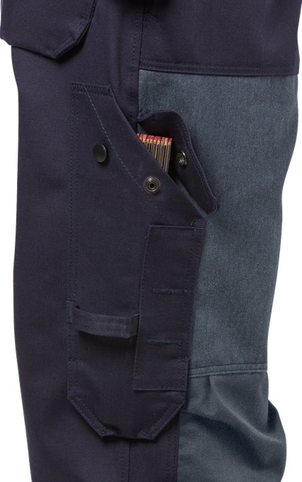 - 2 Vordertaschen, 2 CORDURA®-verstärkte Gesäßtaschen mit Patte und verdecktem Druckknopfverschluss