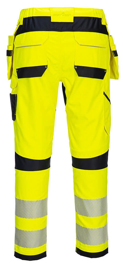 Innovative Warnschutzhose aus strapazierfähigem Zwei-Wege-Stretchmaterial für maximale Bewegungsfreiheit bei der Arbeit. Zu den cleveren Funktionen gehören multifunktionale, abnehmbare Holstertaschen mit Reißverschluss, von oben zugängliche Kniepolstertaschen und eine leicht zugängliche Oberschenkeltasche zur sicheren Aufbewahrung von Telefon, Schlüssel und Werkzeugen. FR-Verstärkungsgewebe an wichtigen Abriebstellen für maximale Haltbarkeit.