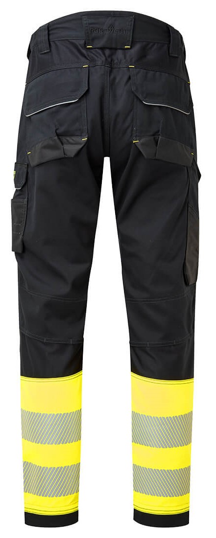 Innovative FR Warnschutzhose aus strapazierfähigem Zwei-Wege-Stretchmaterial für maximale Bewegungsfreiheit bei der Arbeit. Zu den cleveren Funktionen gehören multifunktionale, abnehmbare Holstertaschen mit Reißverschluss, von oben zugängliche Kniepolstertaschen und eine leicht zugängliche Oberschenkeltasche zur sicheren Aufbewahrung von Telefon, Schlüssel und Werkzeugen. FR-Verstärkungsgewebe an wichtigen Abriebstellen für maximale Haltbarkeit.
