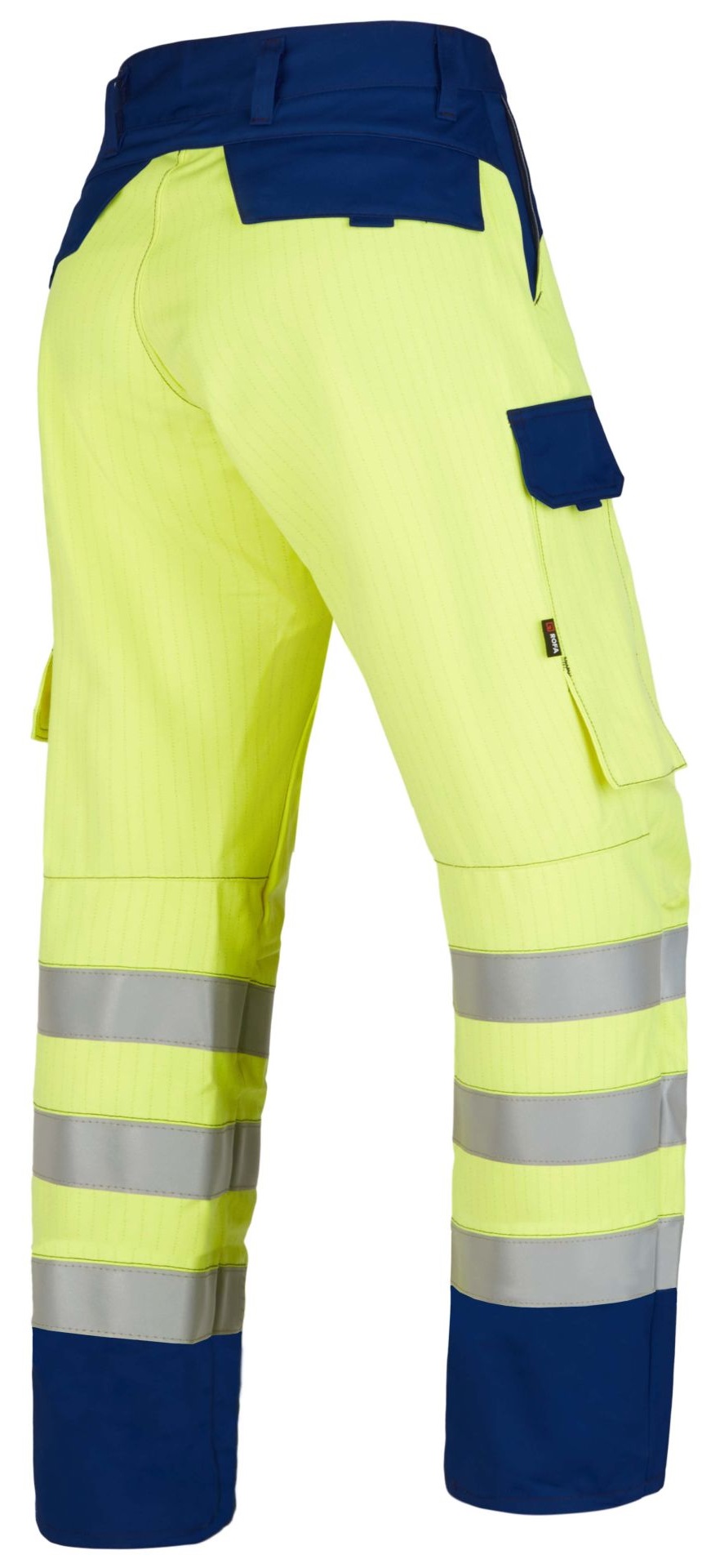 Bund mit Gürtelschlaufen und Knopf • Schlitz mit Reißverschluss • 2 Seitentaschen • links Cargotasche mit aufgesetzter Smartphonetasche jeweils mit Patte • rechts Zollstocktasche mit Patte • 2 Gesäßtaschen mit Patte • alle Patten mit Druckknöpfen • einfache Hosenbeinverlängerung durch skandinavischen Saum • 70 mm Reflexstreifen um Beine