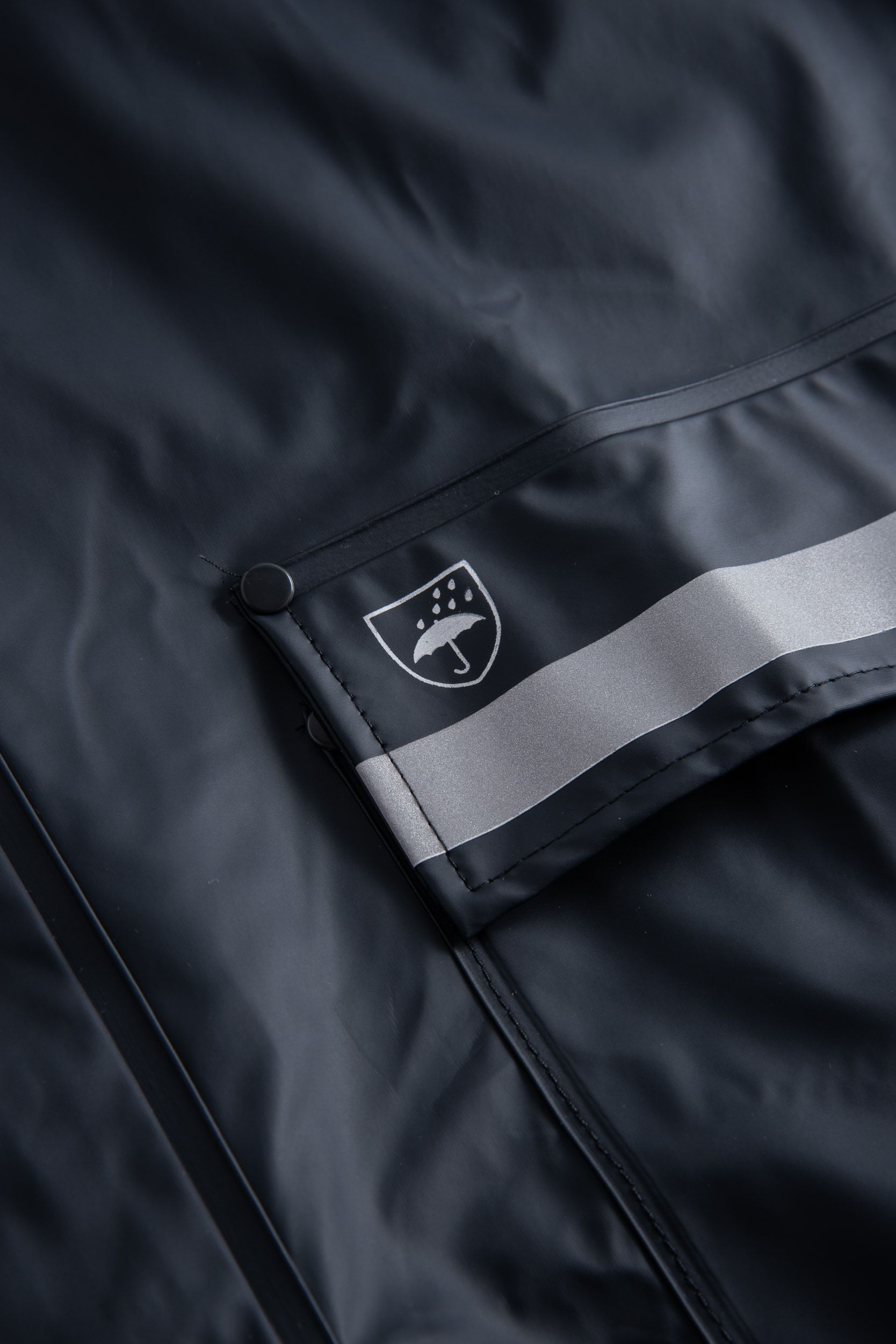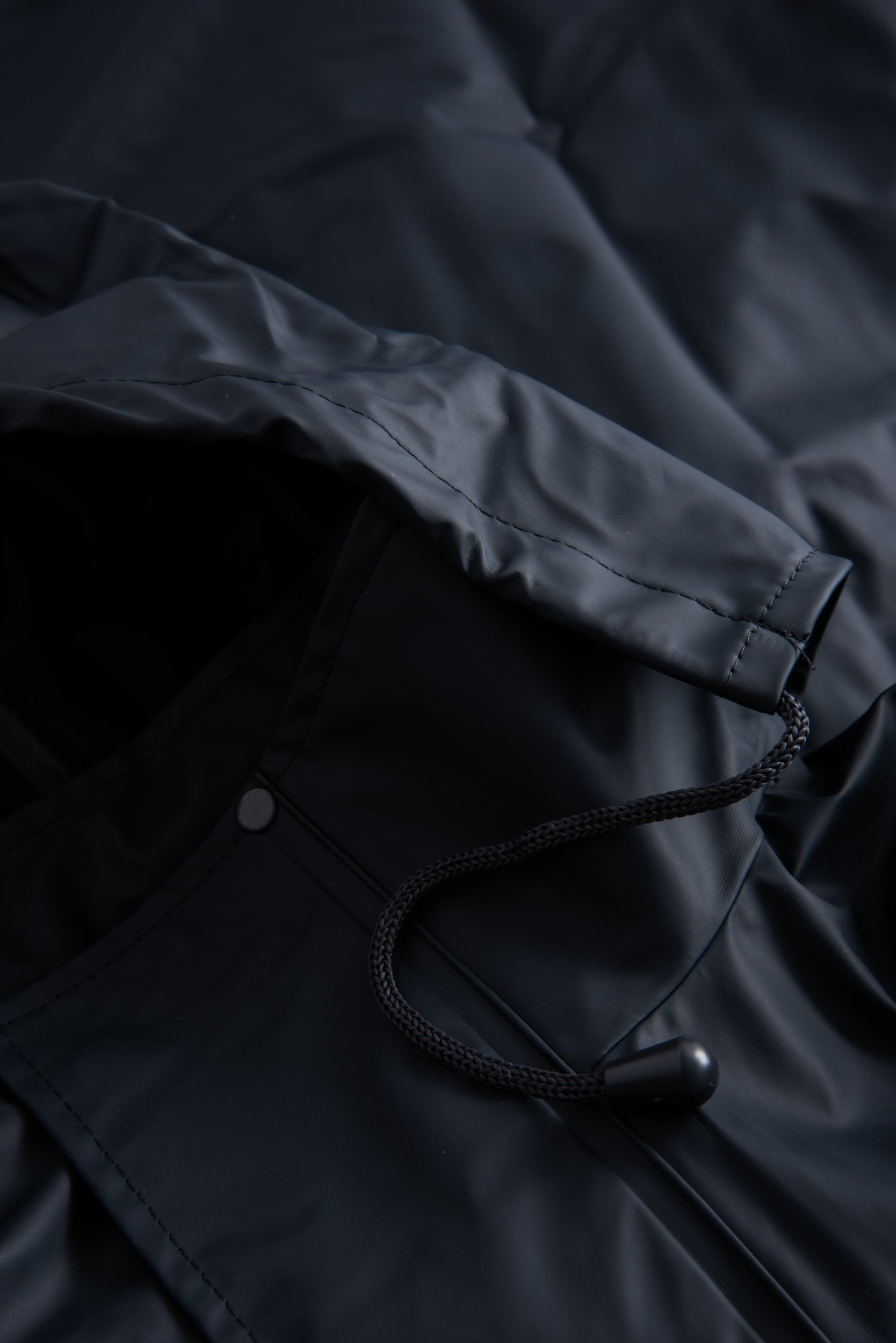 - Feste Kapuze mit Kordelzug, versteckt im Kragen