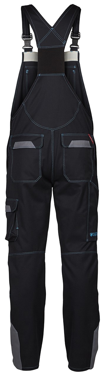 Latzhose mit elastischem Rückenteil und verstellbaren Trägern. Außentasche mit Patte und Klettverschluss. Auf der Außentasche befindet sich eine weitere verdeckte Reißverschlusstasche. Zwei Einschubtaschen. Zwei Gesäßtaschen mit Patte und Klettverschluss. Zollstocktasche. Schenkeltasche mit Innenschlaufe mit D-Ring (vorne) zur Befestigung einer ID-Karte. Die Schenkeltasche ist sehr geräumig und sorgt dank des freihängenden Bodens für uneingeschränkte Bewegungsfreiheit. Ergonomisch geformte Knie. Knieverstärkung/Knietaschen, unten mit Klettver-schluss. Antistatisch und flammhemmend. Für Industriewäsche geeignet.
