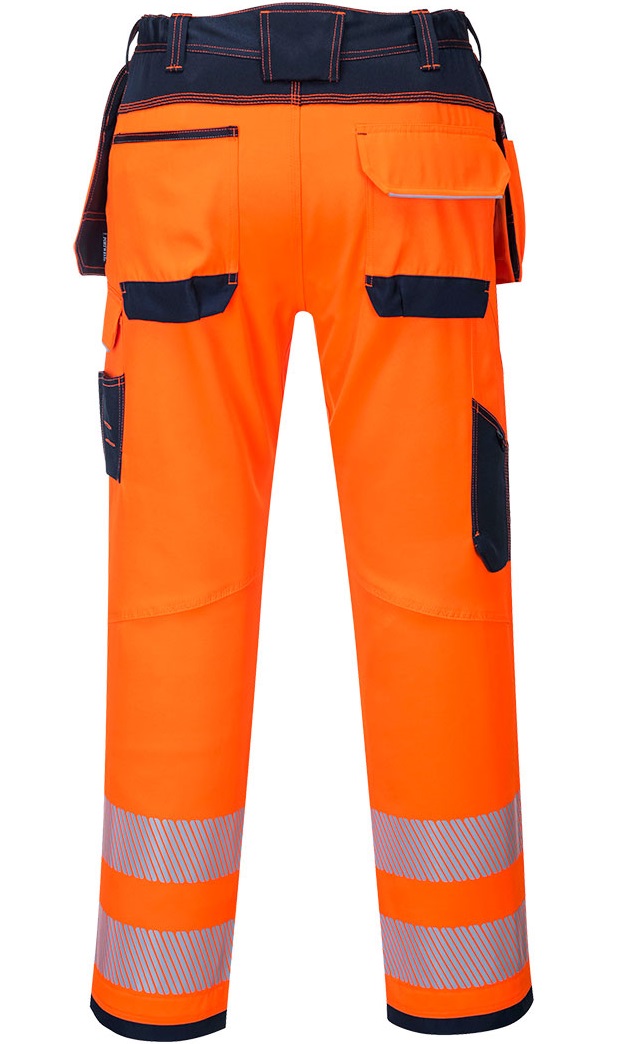 Eine durchdachte, innovative Warnschutzhose mit multifunktionalen Holstertaschen, Knieschpolstertaschen und bequemen Zugriff auf mehrere Oberschenkeltaschen für die sichere Aufbewahrung von Mobiltelefon, Schlüsseln und Werkzeug. Oxford Gewebeverstärkung an den Belastungspunkten und dreifache Nähte garantieren maximale Haltbarkeit.