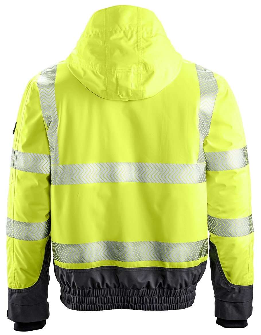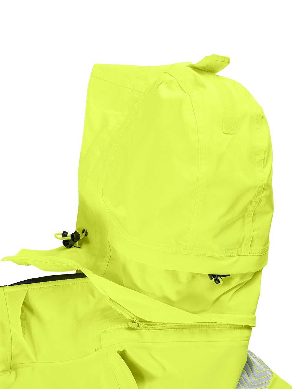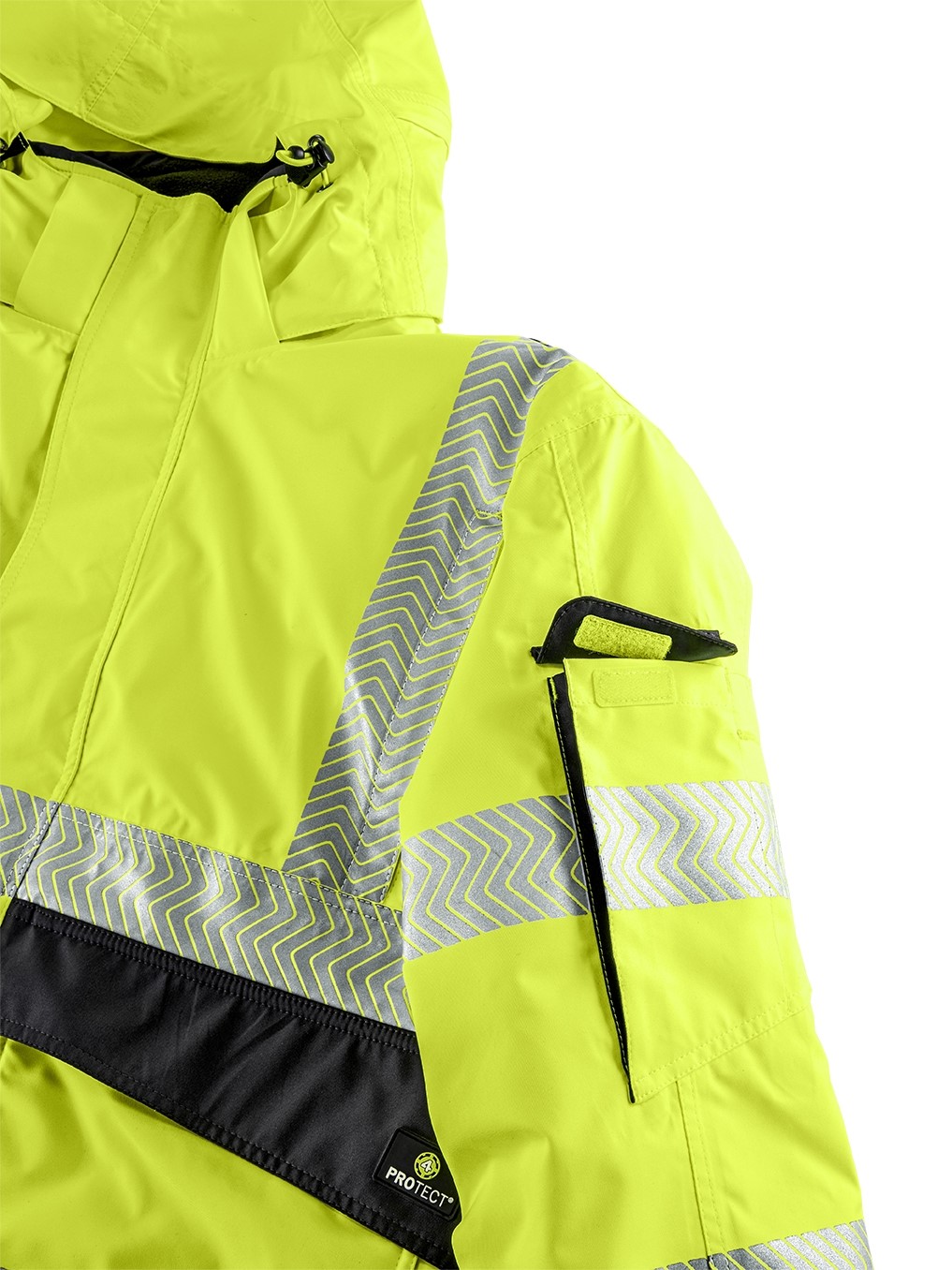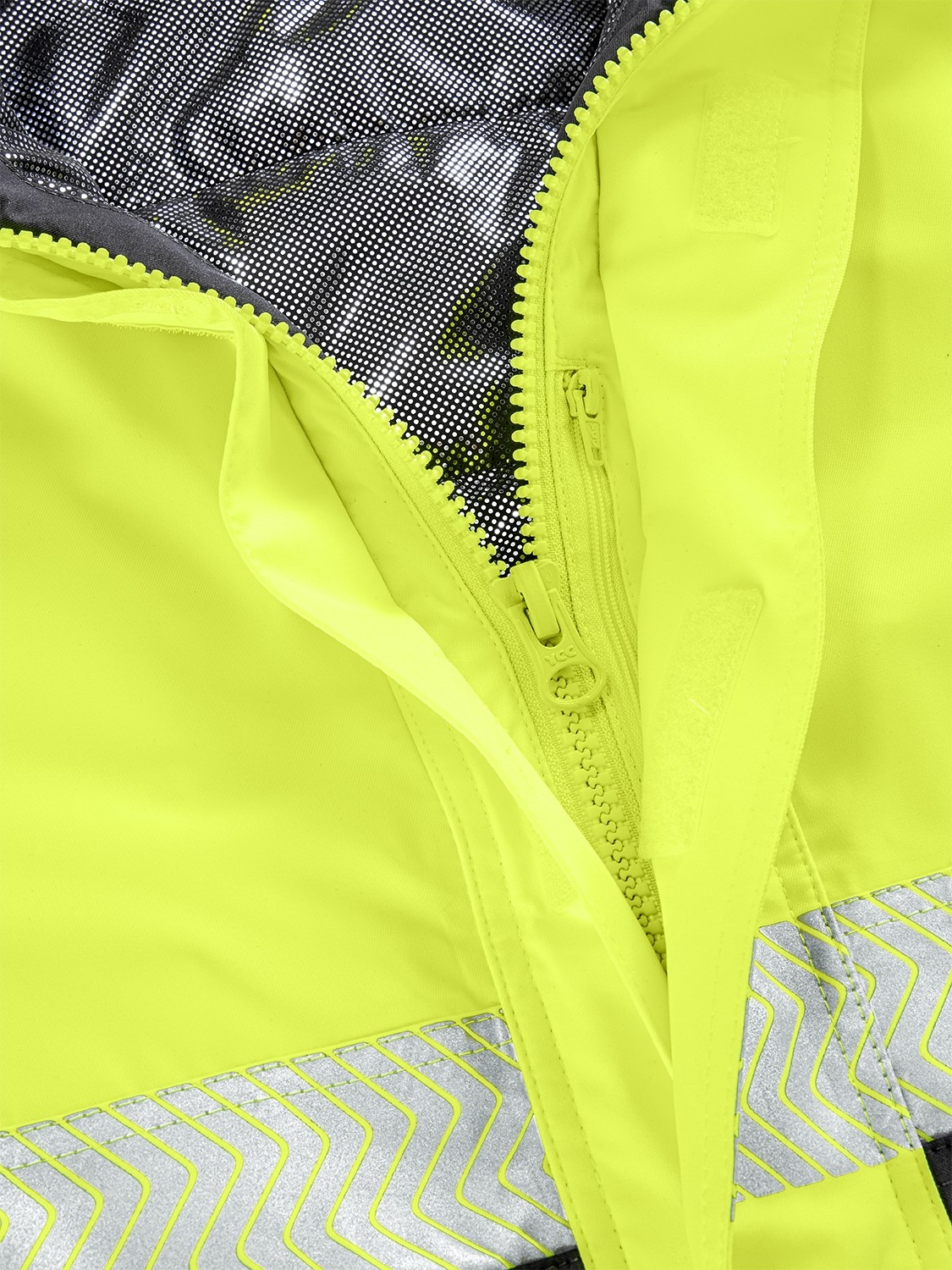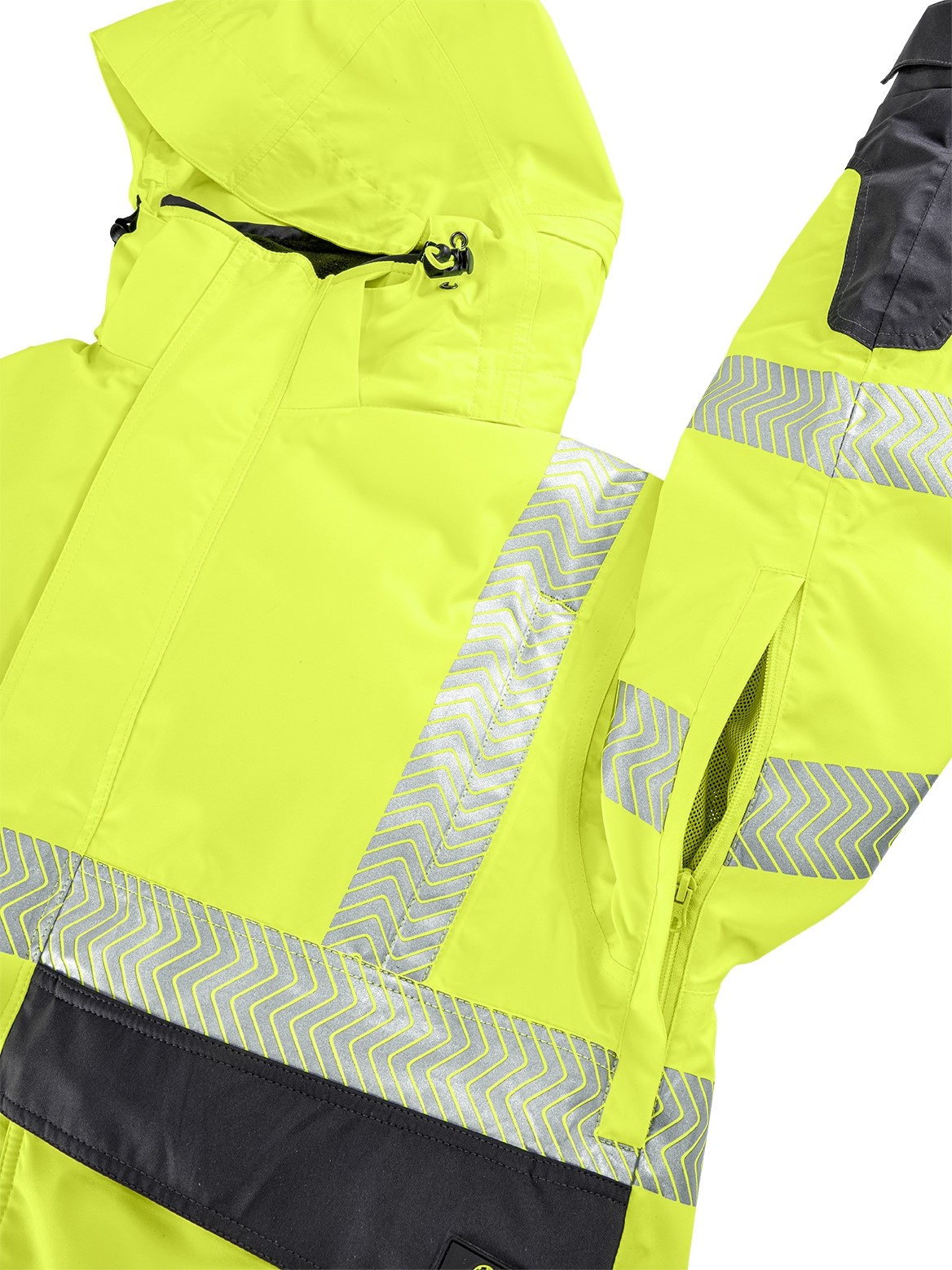 - Segmentierte, auflaminierte Reflexstreifen, umlaufend um Körper und Ärmel sowie über die Schulterpartien (Hosenträgerreflexstreifen)