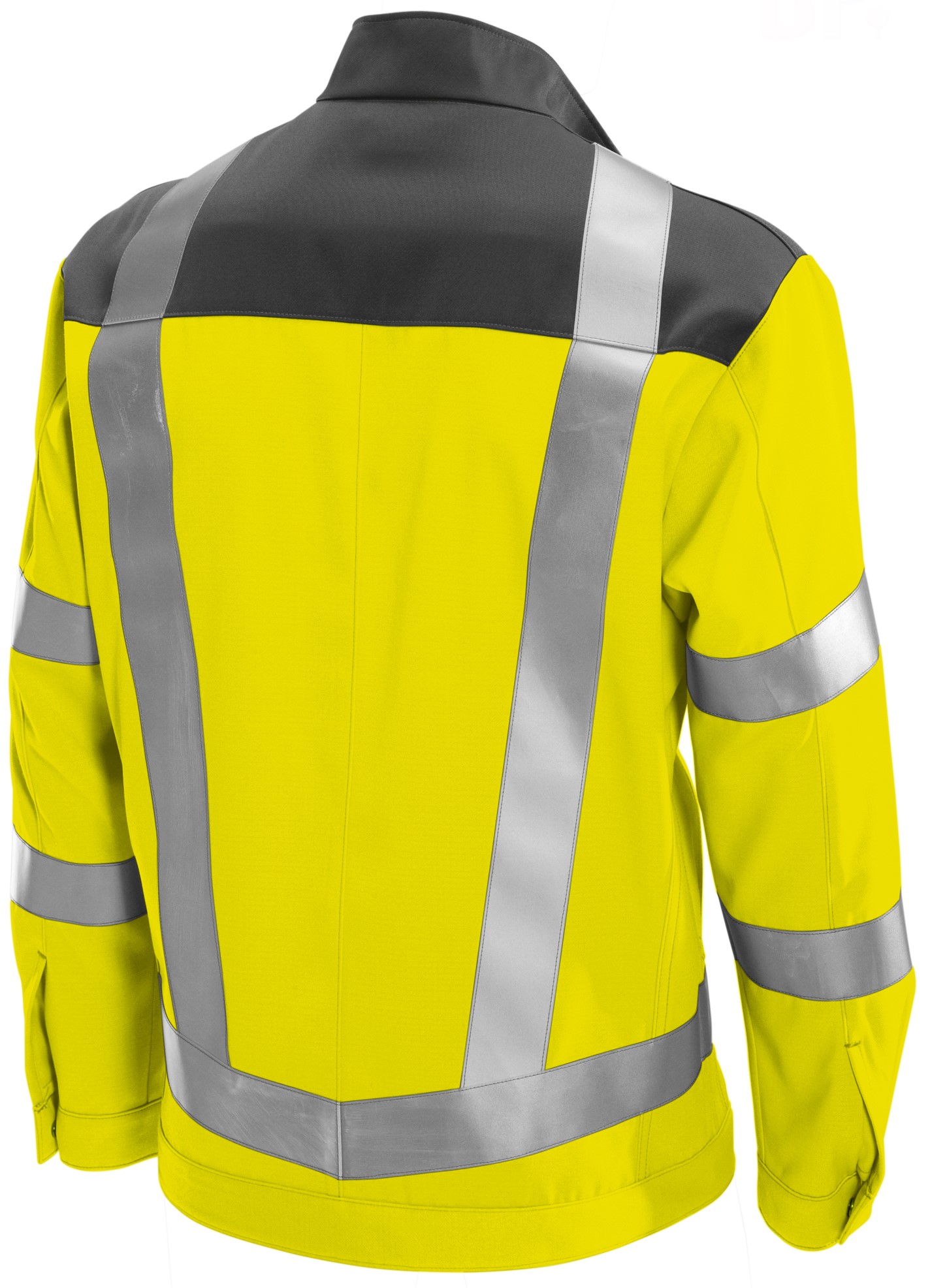 - Je 2 Reflexstreifen auf dem Ärmel, 1 umlaufender Reflexstreifen oberhalb des Bundes, 2 umlaufende vertikale Reflexstreifen vorn und hinten