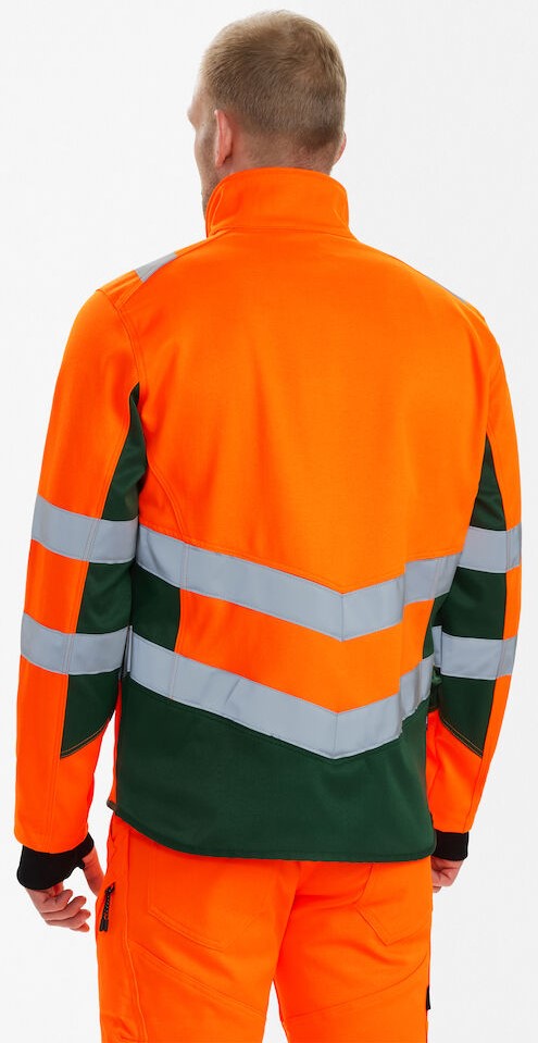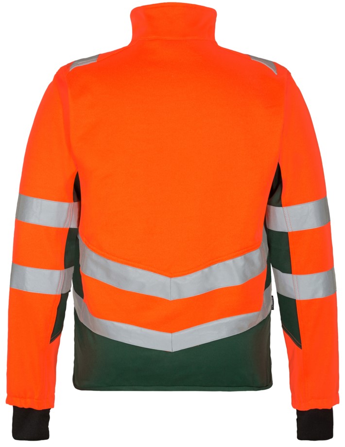 Dehnbare und funktionelle fluoreszierende Arbeitsjacke im modernen Design. Die Jacke hat einen hohen Kragen und ist hinten länger geschnitten. Der dehnbare Stoff bietet viel Komfort und Bewegungsfreiheit. Reißverschluss vorne. Zwei geräumige Seitentaschen sowie eine Brusttasche, jeweils mit Reißverschluss. Zusätzlicher Windfang aus Rippstrick an den Ärmeln. Der Windfang mit Daumenloch kann zum Schutz vor Kälte über die Hand gezogen werden. Reflexstreifen über die Schulterpartie hinweg sowie rund um Ärmel und Taille. Bekleidungsklasse 2. Nach 50 mal Waschen getestet.