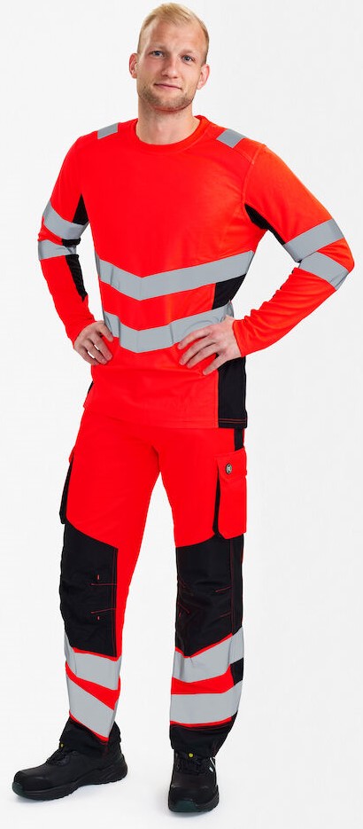 Bequemes und schickes, langärmeliges T-Shirt mit Warnschutzfunktion im modernen Design. Das T-Shirt besteht aus bequemem Pikee-Stoff mit Baumwolle auf der Innenseite für mehr Komfort. Rippstrick am Halsausschnitt. Reflexstreifen an der Schulterpartie sowie rund um Ärmel und Taille. Bekleidungsklasse 2. Nach 25 mal Waschen getestet.
