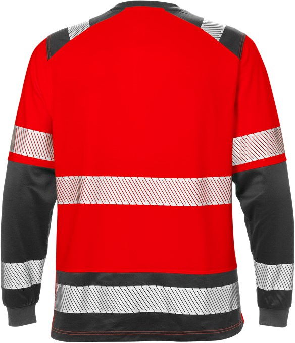 Langärmeliges Warnschutz-T-Shirt mit elastischem Reflexband für zusätzliche Bewegungsfreiheit. Hergestellt aus einem weichen und bequemen Material mit Baumwolle auf der Innenseite. Transportiert Feuchtigkeit, trocknet schnell und ist UV-geschützt. Kontrastbereiche, in denen das T-Shirt am meisten Schmutz und Erde ausgesetzt ist.