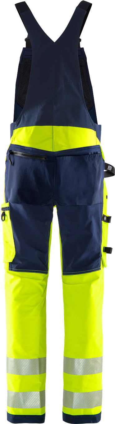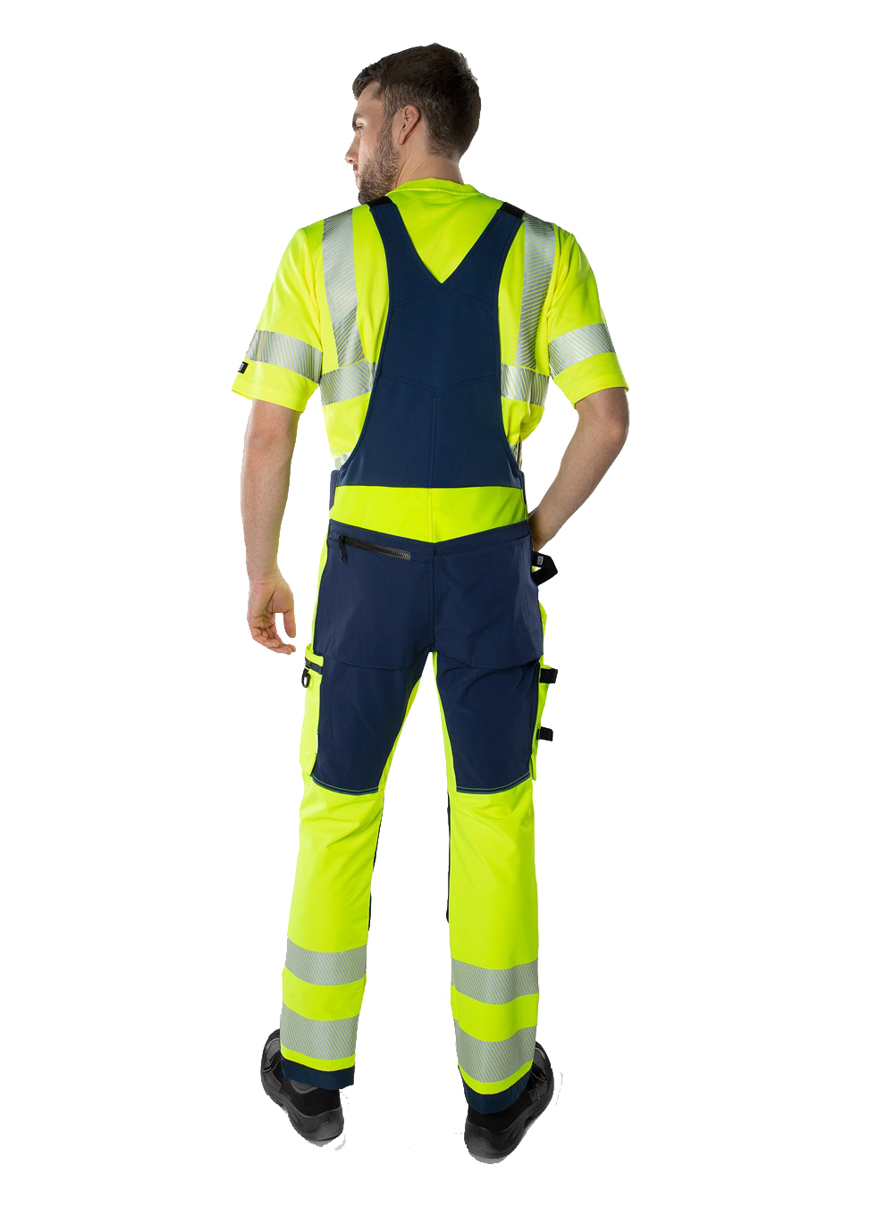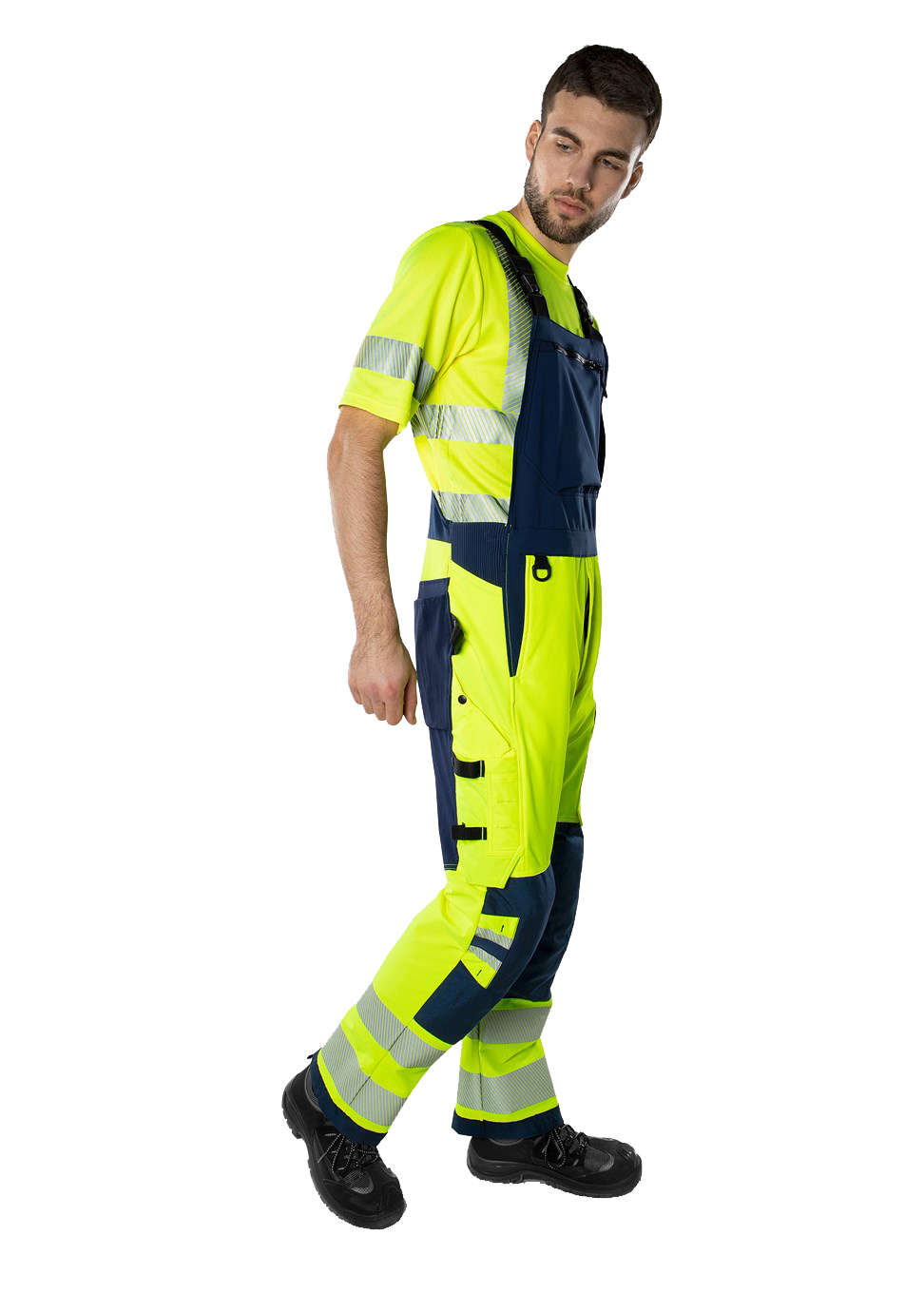 Nachhaltige, hochsichtbare Stretch-Latzhose aus 4-Wege-Stretchmaterial mit Stretcheinsätzen am Bund. Hergestellt aus biobasierten und recycelten Materialien und an exponierten Stellen verstärkt. Mit EPD (Environmental Product Declaration). Konzept: Stiby