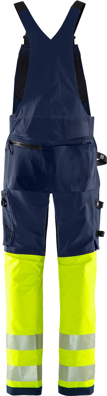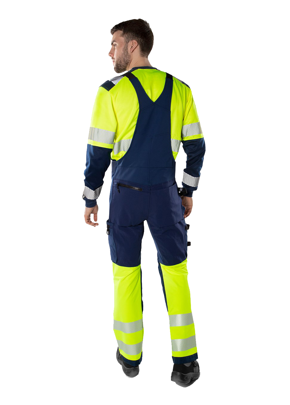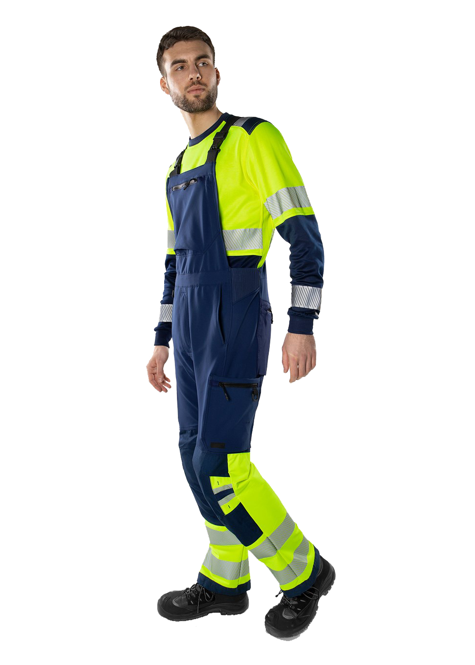 Nachhaltige, hochsichtbare Stretch-Latzhose aus 4-Wege-Stretchmaterial mit Stretcheinsätzen am Bund. Hergestellt aus biobasierten und recycelten Materialien und an exponierten Stellen verstärkt. Mit EPD (Environmental Product Declaration). Konzept: Stiby