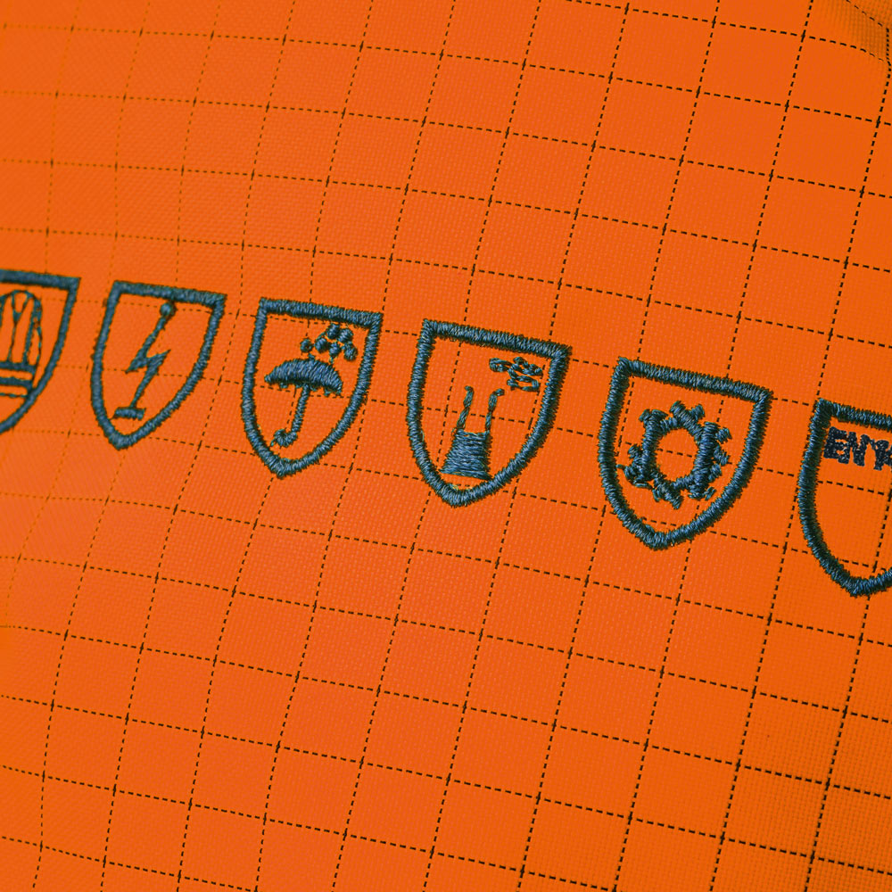 - der Parka ist von außen als Multinorm-Schutzbekleidung erkennbar durch die Multinorm-Embleme auf dem linken Oberarm