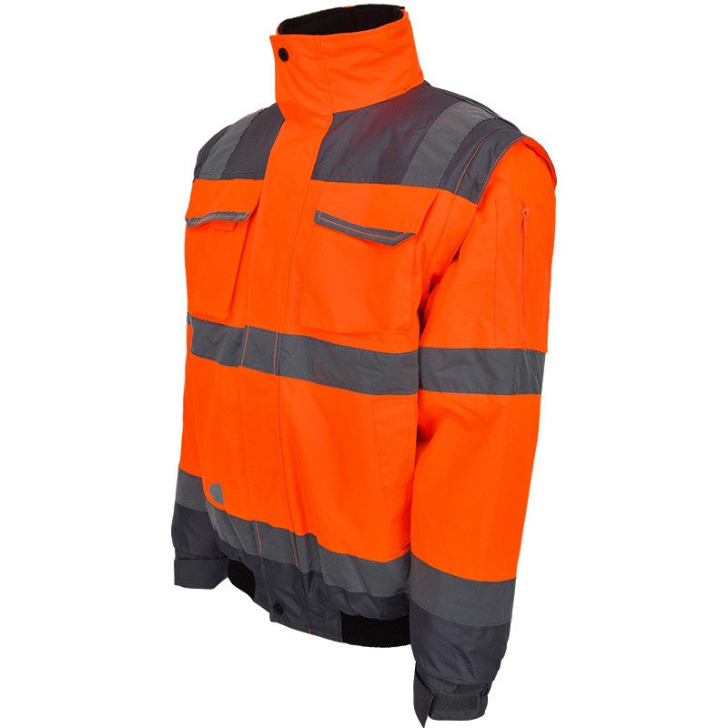 Warnschutz Pilotenjacke, neonorange / grey, Material ist wind- und wasserdicht, Ärmel abnehmbar, Reflexstreifen, mit Schulterreflex, Nähte geschweißt, Kapuze im Kragen integriert, fleecegefütterter Kragen, Ärmelabschlüsse weitenverstellbar und mit integriertem Strickbund, Strickbund am Saum, mit Patte abgedeckter Front-Reißverschluss, 1 Ärmeltasche mit Reißverschluss, 2 Brusttaschen mit Patten, rechte Seite mit aufgesetzten Stift- und Handytasche, 2 Seitentaschen, 1 Innentasche im Futter