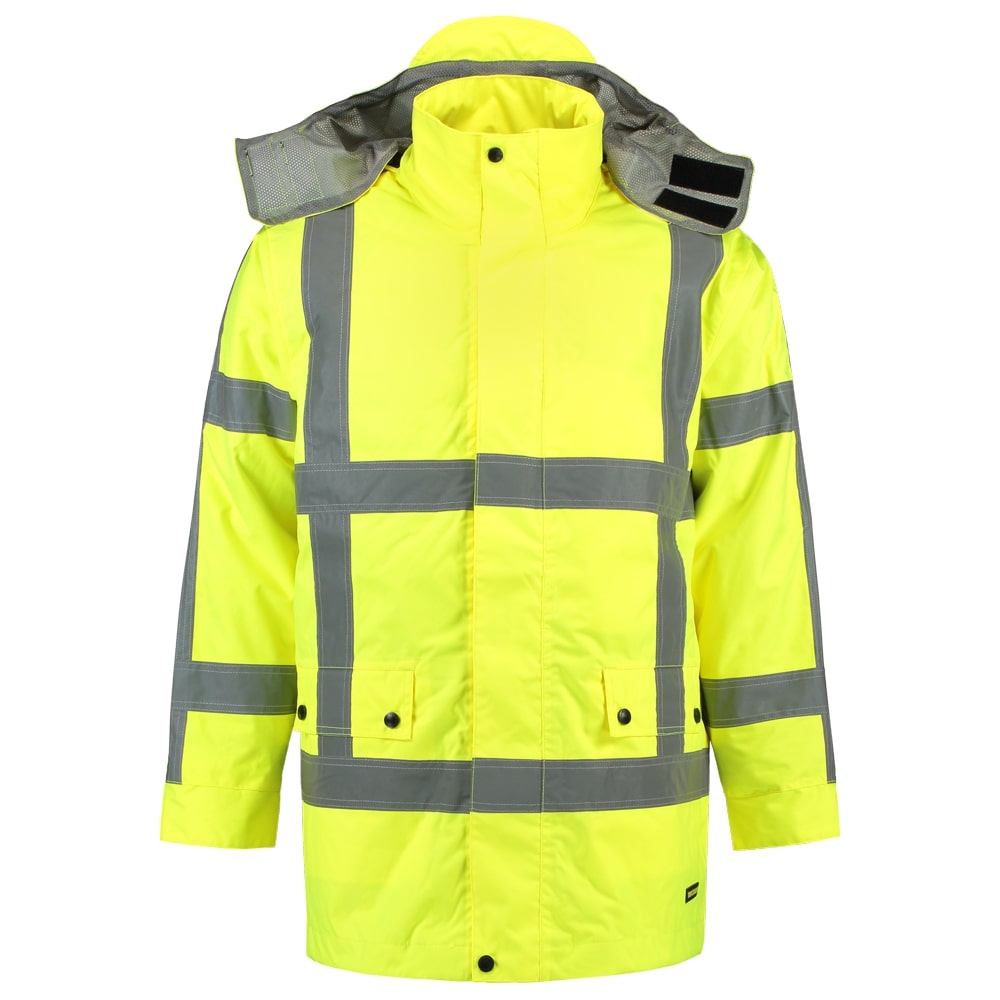 High-Visibility-Parka gemäß der Richtlinien des Rijkswaterstaat (RWS). Wind- und wasserdicht, atmungsaktiv nach EN343 Klasse 3:3. Mit versiegelten Nähten, PU-Beschichtung und wasserabweisenden Reißverschlüssen. Hohe Sichtbarkeit nach EN ISO 20471:2013, Klasse 3. Der Parka hat eine Kapuze, die mittels Reißverschluss abgenommen oder im Kragen verstaut werden kann. Mit wasserabweisendem Reißverschluss, einer Innentasche und einer Tasche fürs Handy. Längeres Rückenteil, 2-Wege-Reißverschluss teilbar und doppelte Wetterschutzleiste mit Regenrinne. Der Parka hat ein herausnehmbares Thermofutter und eignet sich für fast alle Jahreszeiten.
