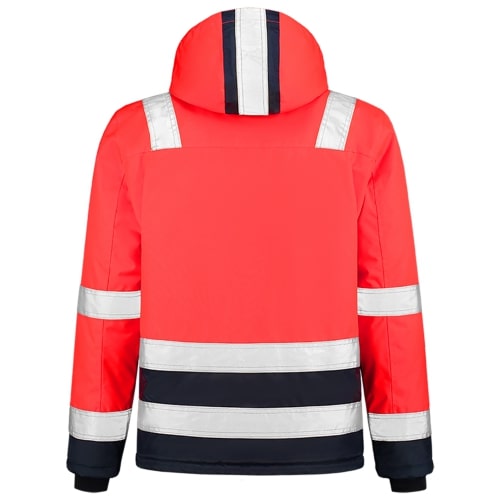 Der Warnschutz Midi Parka Bicolor ist Teil der Tricorp 20/20 Vision-Kollektion. Dieser Parka ist nach EN ISO 20471:2013 Klasse 2 zertifiziert. Dadurch ist der Träger bei Tag und Nacht sichtbar und geschützt. Neben verbesserter Sichtbarkeit bietet diese Jacke dank der EN 343 Klasse 3:1:X-Zertifizierung auch Schutz gegen Niederschlag (Regen, Schnee), Nebel und Feuchtigkeit. Die Jacke hat eine abnehmbare Kapuze. Die vielen Taschen bieten reichlich Stauraum. Durch den Druckerreißverschluss kann der Parka optimal veredelt werden. Beim Bücken bleibt der Rücken durch ein verlängertes Rückenteil geschützt. Das Rückenteil kann aus- und eingeklappt werden. Die Jersey-Bündchen mit Daumenöffnung bieten zusätzlichen Schutz und halten die Hände warm. Der Saum des Parkas kann mittels Tunnelzug individuell verstellt werden.