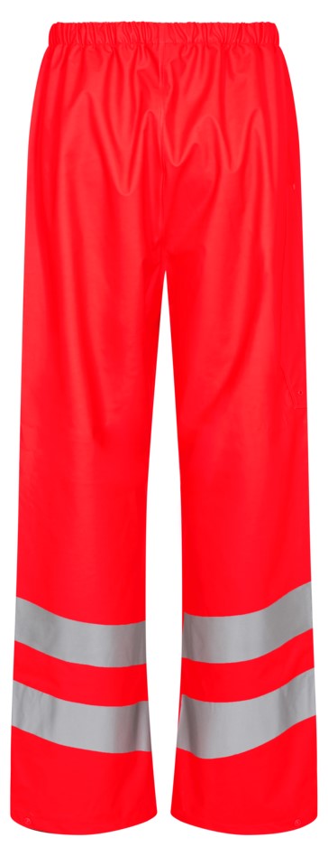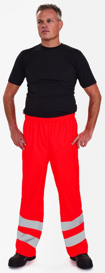 Funktionelle Regenhose mit verschweißten Nähten. Verstellbarer Gummizug in der Taille. Funktionelle Zollstocktasche. Verstellbare Beinweite an den Hosenbeinabschlüssen. Bekleidungsklasse 2. Getestet nach 5 Wäschen