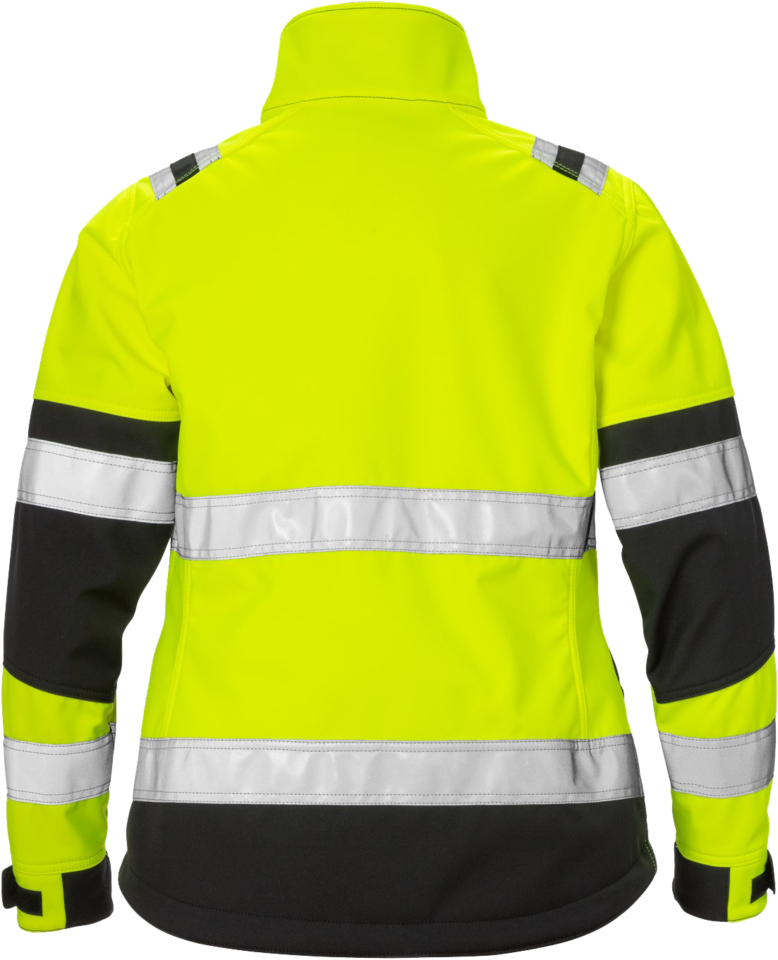 Moderne zweifarbige Warnschutzjacke für Damen aus robustem und dehnbarem Softshell-Material zum Schutz gegen Wind und Regen, mit funktionellen Taschenlösungen.