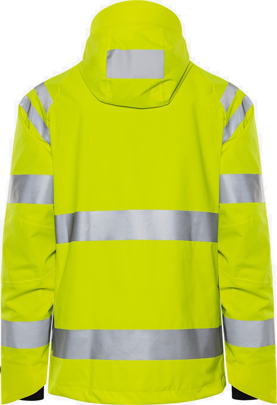Funktionsjacke mit hoher Sichtbarkeit aus weichem und flexiblem Recyclingmaterial. Wasserdichte, winddichte und atmungsaktive Arbeitsjacke mit verschweißten Nähten. Bequeme Ganzjahresbekleidung, die bei Kälte mit einer isolierenden Zwischenschicht kombiniert werden kann. Konzept: Trofta