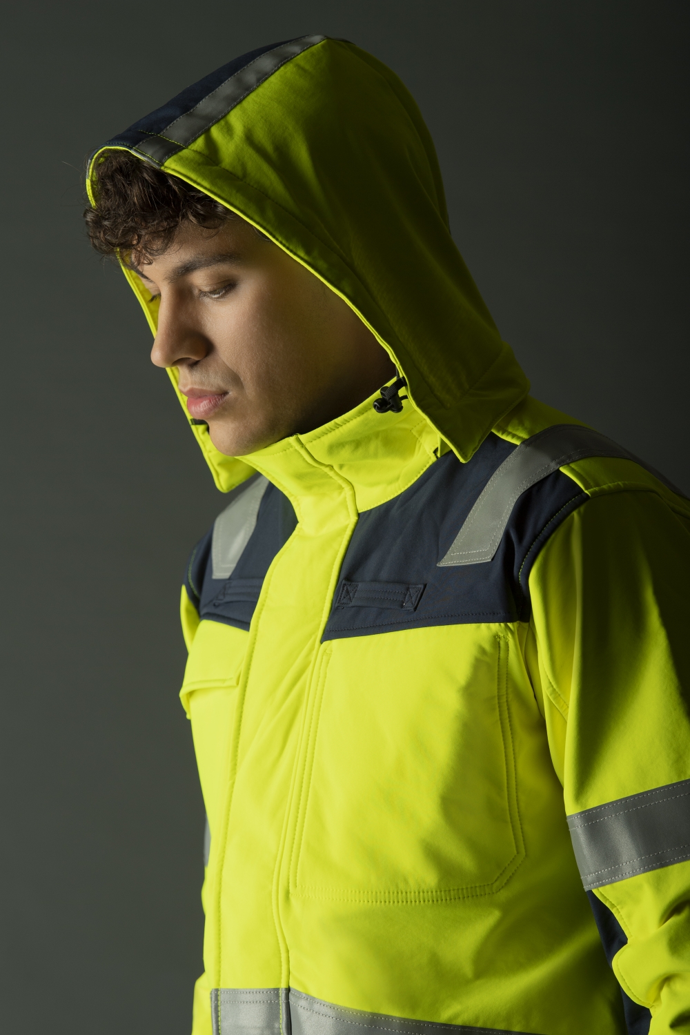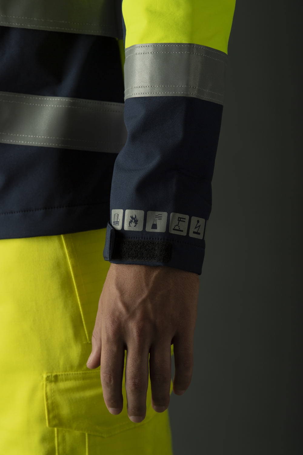 Die Softshelljacke Multinorm Bicolor aus der Tricorp Safety-Kollektion besteht aus 60% Modacryl, 38% Polyester und 2% Sonstige Fasern. Gewicht: 350 g/m2. Dieses Produkt ist nach EN ISO 11612 (Schutz gegen Hitze und Flammen) und EN 1149 (Elektrostatische Eigenschaften) zertifiziert. Durch die EN ISO 20471-Zertifizierung bietet das Kleidungsstück beste Sichtbarkeit bei Tag, Dämmerung und Nacht. Zur Vermeidung des Durchsatzes mit Farbe empfehlen wir, lediglich Drucktechniken zu nutzen, die für Softshellstoffe geeignet sind.