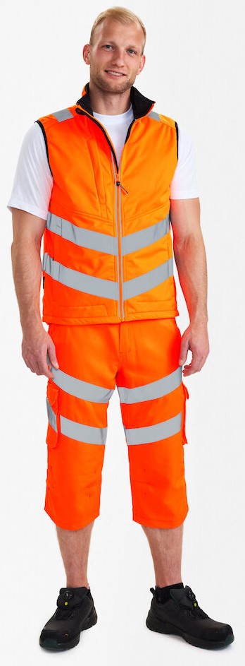 Funktionelle, fluoreszierende Softshell-Weste im modernen, attraktiven Design mit wind- und wasserabweisenden Eigenschaften. Die Weste ist innen und am Kragen mit Fleece gefüttert, und daher weich und angenehm auf der Haut. Hochwertige Stretch Qualität, die für Komfort und Bewegungsfreiheit sorgt. Hammerschlaufen an beiden Seiten. Reflektierender Reißverschluss vorne. Zwei geräumige Seitentaschen sowie eine Brusttasche, jeweils mit Reißverschluss. Zwei große Innentaschen mit Klettverschluss. Die Weste hat unten und am Armloch ein elastisches Bündchen. Reflexstreifen rund um Schulterpartie und Taillenbereich. Bekleidungsklasse 1. Nach 25 mal Waschen getestet.