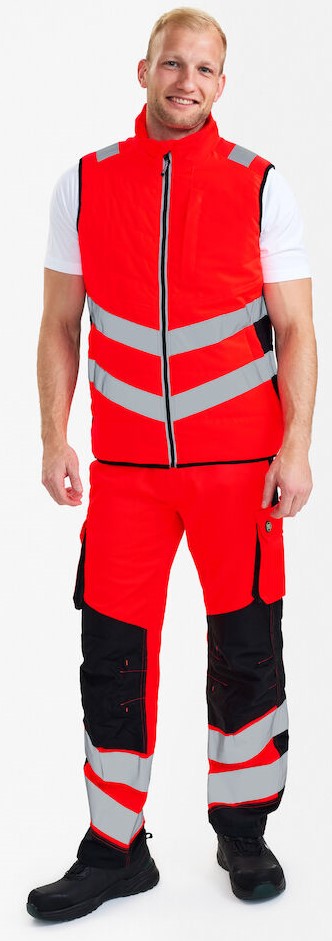 Warme, fluoreszierende Weste im modernen Design mit wind- und wasserabweisenden Eigenschaften. Die Weste kann mit den Modellen 1146-930 kombiniert werden, die einen Reißverschluss zum Einzippen haben. Reflektierender Reißverschluss vorne. Zwei Seitentaschen sowie Brusttasche mit Reißverschluss. Die Weste hat unten und am Armloch ein elastisches Bündchen. Reflexstreifen über die Schulterpartie hinweg sowie rund um die Taille. Bekleidungsklasse 1. Nach 50 mal Waschen getestet.
