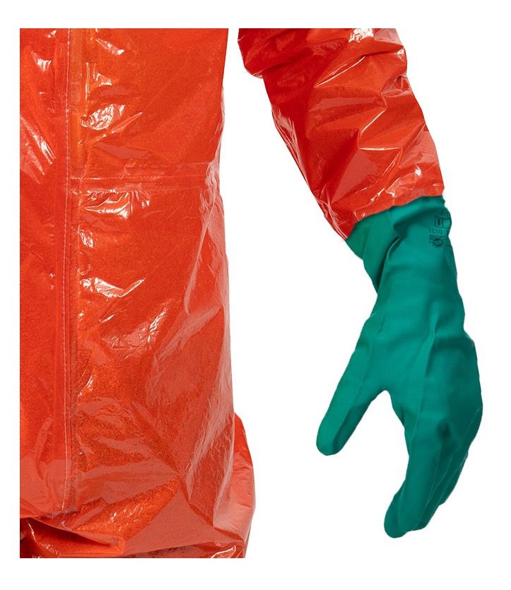 Fest angearbeitete silikonfreie KCL Camatril 730 Handschuhe aus Nitril runden den Anzug ab. Der Handschuhe bietet ihnen eine gute Abrieb-, Stich- und Schnittfestigkeit, ist beständig gegen Säuren, Laugen, langkettige Alkohole und aliphatische und alicyclische Kohlenwasserstoffe.